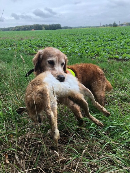 Frederik und Tanja schickten uns Fotos von Jester auf der Jagd. Mit 14 Jahren und fast taub hat Jester noch einen Riesenspass an der Jagd und hat...wenn man das so sagen darf, mit einem Grinsen im Gesicht einen Hasen apportiert. Frederik sagt, er konnte ihn nicht davon abhalten...gelernt ist eben gelernt und die Jagd steckt tief in ihm. Nach einem halben Tag durfte er sich dann ausruhen, was ihm so gar nicht gefallen hat.