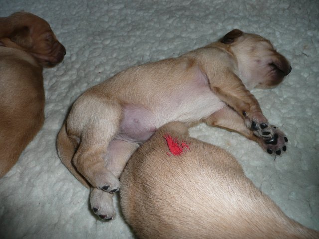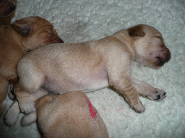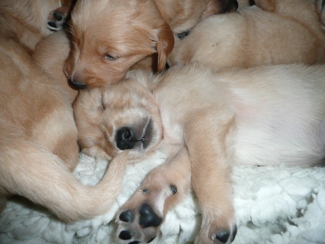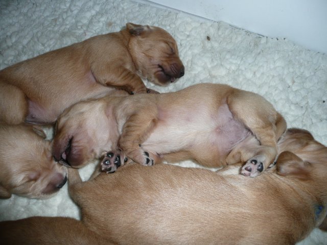 Ab dem 10. Lebenstag der Welpen konnte man beobachten, dass die Augen sich zu einem Spalt öffneten.....nun beginnt ein neuer Lebensabschnitt. Merle verbringt immer noch den überwiegenden Teil des Tages bei ihren Kleinen. Ab und an liegt sie auch schon mal ausserhalb der Wurfkiste aber sie bleibt freiwillig im Welpenzimmer. So hat sie die Kleinen besser im Blick. Mittlerweile haben alle Welpen die Augen geöffnet und Geräusche nehmen sie auch schon wahr. Am Besten ist der Geruchssinn ausgeprägt. Die kleinen Näschen nehmen sofort wahr, wenn ich neben der Kiste stehe oder wenn Merle von einem *Ausgang* wieder ins Welpenzimmer kommt, dann recken sie die Köpfchen in die Höhe und wackeln auf ihren Beinchen der Geruchsquelle entgegen. Ja noch können die Beinchen nicht so schnell wie Kleinen es wollen, aber von Tag zu Tag werden die Gehversuche sicherer. Mittlerweile können sie auch schon richtig Bellen und Heulen, besonders wenn Merle nicht schnell genug mit der Milchbar kommt. Um Merles Gesäuge zu schützen, mußte ich bei den Kleinen schon die Krallen schneiden....während ihrer Ruhephase ging es ganz gut. Die erste Wurmkur haben sie auch schon bekommen, was nicht so gut ankam....aber was sein muß, muß sein ;-)