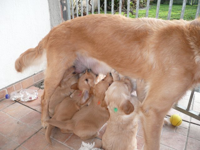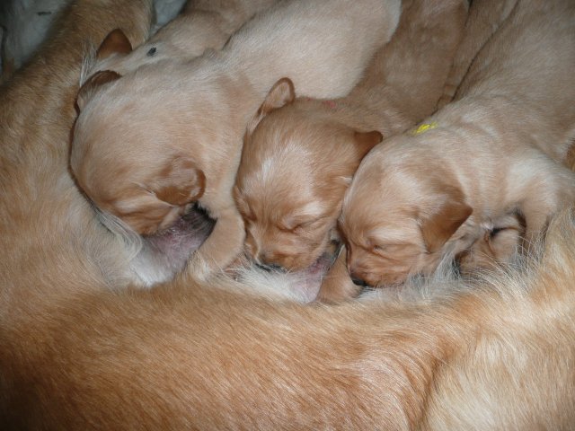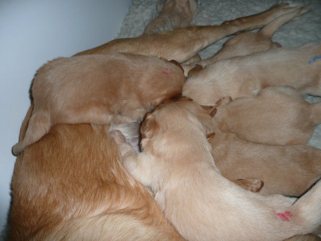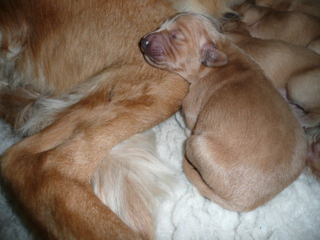 Der Samstag Morgen begann bei uns um 5:30 Uhr, raus in den Garten....rein in die Wohnung...zwei Runden um den Tisch...raus in den Garten.....hier mal ein bisschen buddeln und da mal ein bisschen buddeln....rein in die Wohnung und gehechelt wurde schon heftig. Als dann die Sonne höher stieg, konnte ich es mir auf unserer Terasse bequem machen und so hielten wir uns den ganzen Vormittag draussen auf und genossen den schönen sonnigen Tag. Als der Mittag kam, dachte ich...*es kann ja mal bald losgehen* aber ausser Rennerei und Hechelei tat sich noch nichts und so setzte ich mich wieder in die Sonne und beobachtete die werdende Mutter. Ich wollte Merle nicht alleine lassen, das verrückte Luder wollte doch in ihrem Zustand über unseren Zaun im Garten springen. Der Zaun trennt den Hundegarten vom Menschengarten, damit nicht alles durchwühlt wird, er ist 1,50m hoch und Merle geht im normalen Zustand aus dem Stand herüber....aber mit ihrem Bauch mußte das ja nicht sein. Also sitzen und warten....der Nachmittag kam, es wurde schon wieder dämmrig, dann dunkel und so langsam gab ich die Hoffnung auf eine Geburt am Tage auf. Zwischen der Rennerei und Hechelei legte Merle sich in ihre Hundekiste, schlief tief und fest und von Wehen war nichts zu sehen. Mein Mann und ich legten uns abwechselnd hin um wenigstens etwas Ruhe zu finden. Um 2:00Uhr ging es dann so langsam los, das erste Fruchtwasser ging ab, Merle lag fest in ihrer Kiste und ich konnte die erste Wehentätigkeit sehen....Gott sei Dank, es geht los. So kam dann um 3:50 Uhr die erste Hündin zur Welt. Merle ganz instinktsicher wußte sofort was sie zu tun hatte, sie packte den Welpen aus und kaute die Nabelschnur durch und leckte und leckte. Der arme Wurm, ich hatte schon Bedenken ob er überhaupt noch Fell am Körper hatte ;-) Bevor die nächsten Wehen einsetzten, brachte ich Mutter und Kind in die Wurfkiste, wo etwas mehr Platz zur Verfügung stand. Nun ging es ganz zügig weiter. Merle machte ihre Sache hervorragend und versorgte jeden Welpen mit großer Hingabe. Mein Mann und ich ließen sie gewähren und hielten uns so ziemlich zurück. Ich sorgte stets für eine trockene Unterlage und so nach und nach kontrollierten wir die Welpen ob alles ok ist und notierten uns ihre Gewichte. Nach dem siebten Welpen machte Merle etwas über eine Stunde Pause. Da wir beim Ultraschall 8 Welpen gesehen hatten, wußte ich, es müsste noch einer kommen. Ich tastete den Bauch ab und sagte zu meinem Mann *ich schätze, es könnten auch noch 2 sein*. So war es dann auch, die letzten Zwei, purzelten kurz nacheinander in die Wurfkiste. Nun konnte ich an Merles Verhalten sehen....sie war fertig. Sie durfte sich einmal im Garten die Beine vertreten und ich richtete in der Zeit die Wurfkiste her. Ich hatte gerade so viel Zeit die Welpen noch einmal zu kontrollieren, da war Merle schon wieder zurück . Nun liegt sie entspannt bei ihren Kindern und geht in ihrer Mutterrolle total auf. Es ist ein herrliches Bild und erfüllt uns immer wieder mit tiefer Dankbarkeit und Freude.
