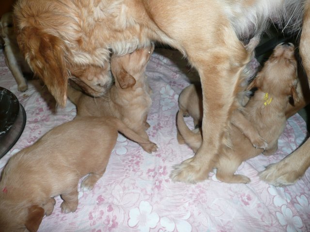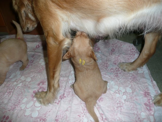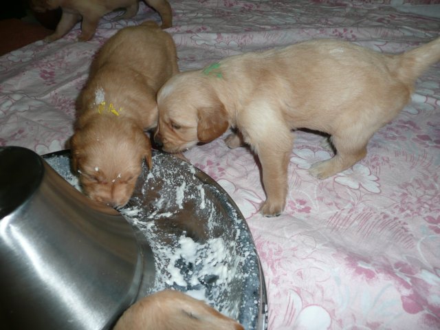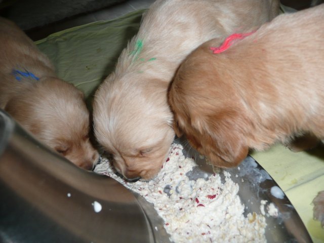 In der dritten Woche haben sich die Kleinen schön weiter entwickelt. Die Augen sind ganz auf, das Gehör funktioniert hervorragend und ihre Bewegungen sind sicher und flott. Wenn ich an die Wurfkiste komme und mit *Baby Baby* locke, kommen sie ganz schnell auf den kleinen Beinchen angesaust und hoffen auf etwas Trinkbarem oder freuen sich auch schon über Streicheleinheiten und quittieren diese mit wedelnden Ruten. Bei ihrem ersten *Aussenauslauf* wurde alles sehr genau untersucht, in jede noch so kleine Ecke mußten sie hineinkriechen. Als es wieder hiess, zurück in die Wurfkiste, war das Geschrei groß....einmal die weite Welt geschnuppert. Merle nimmt sich jetzt schon die ein oder andere Auszeit und beobachtet ihre Puppies aus sicherer Entfernung. Genau wie Genna bei ihrem letzten Wurf, so hat auch sie sich die Wäschewanne ausgesucht und fühlt sich sehr wohl darin. Die erste Milchmahlzeit schmeckte den Kleinen auch schon gut und sie wussten sofort wie sie die Milch am Besten aufnehmen konnten. Gestern habe ich die Milch noch Jedem einzeln angeboten, so durften sie heute alle zusammen aus einer Schale schlabbern. Gut das noch einige Hände mehr da waren, die die Welpen immer wieder aus dem Milchbad befreiten, aber am Ende waren die Bäuchlein rund und gut gefüllt. Sehr viel Bilder habe ich nicht von dieser Woche, die Bewegungsbilder sind leider alle unscharf aber dafür habe ich ein kleines Filmchen gedreht.