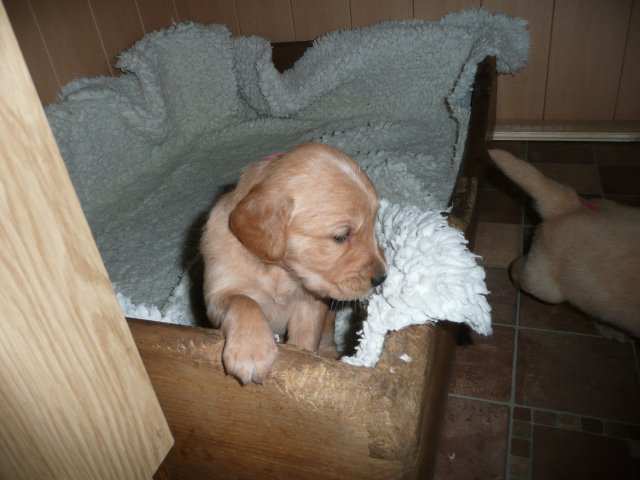 Heute am Sonntag waren die Kleinen das erste Mal im Freien. Als die Tür aufging, drängten sie sofort nach draussen. Was waren da für viele neue und interessante Gerüche, alles mußte untersucht werden. Merle lief aufgeregt zwischen ihren Kleinen herum und versuchte alle zusammen zu halten. Als alles nichts half, stellte sie sich hin und öffnete ihre Milchbar...so hatte sie ihre Bande wieder unter Kontrolle. Ich wollte soviele Bilder machen, aber immer wenn ich in die Hocke ging, hatte ich die Lütten an der Hose und an der Kamera hängen. Onia durfte die Kleinen auch bespielen, aber immer unter den Augen von Merle. Camilla hatte es sich in der Zeit im Korb bequem gemacht und wartete sehnsüchtig dass die Welpen sie entdecken. So nach und nach wurden die Kleinen dann müde und gesellten sich zu Camilla und alle fanden einen Platz im Korb. Wir haben den ganzen Nachmittag nichts mehr von der Bande gehört und gesehen....und von Camilla auch nichts. Als es Fressenszeit war, konnte ich die Kleinen überreden heraus zu kommen und Camilla wiederwillig zum Aufstehen zu bewegen. Einige Fotos kann ich vom heutigen Tag doch noch zeigen.