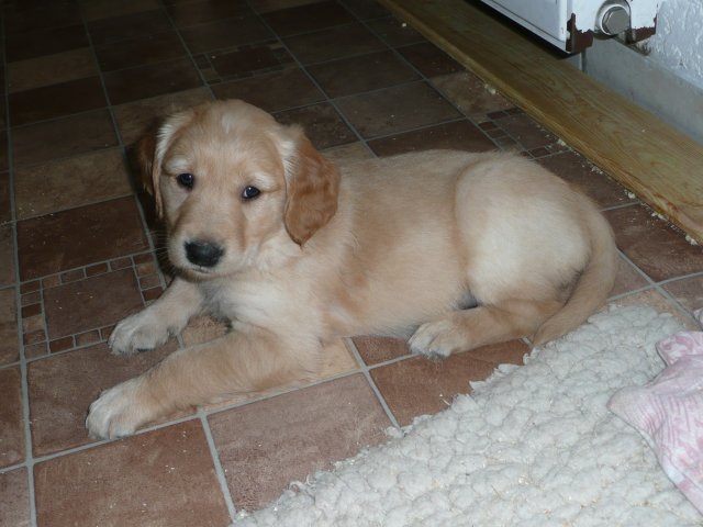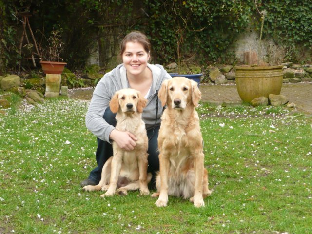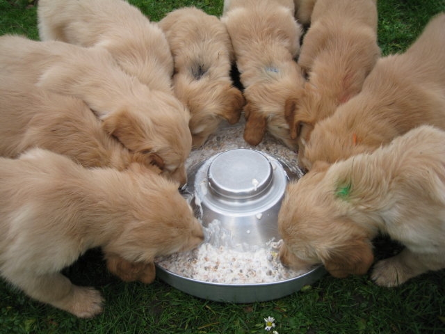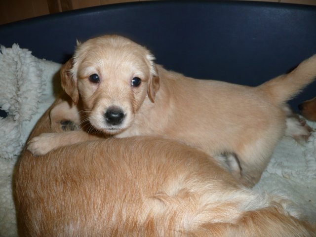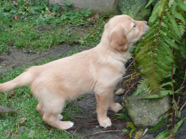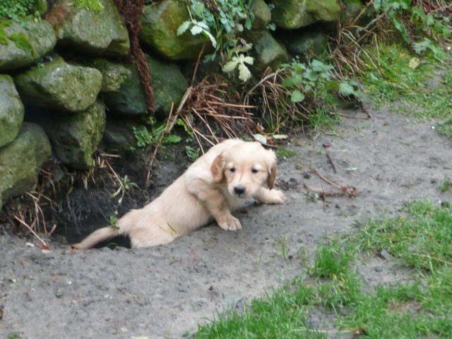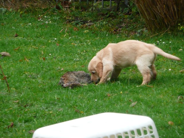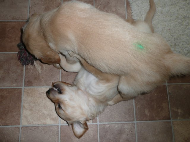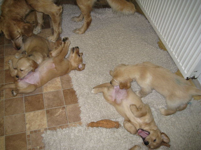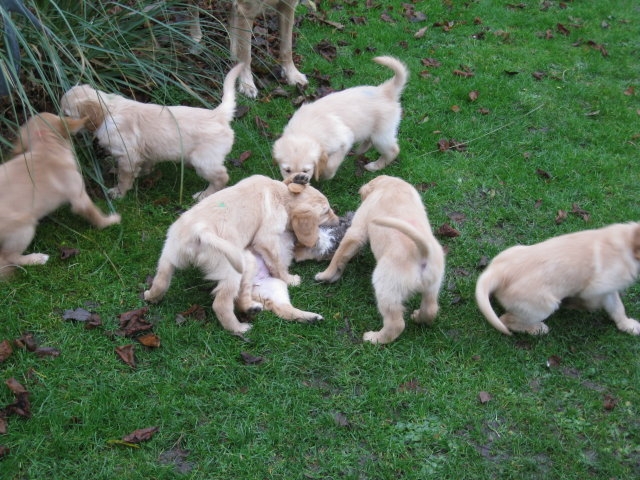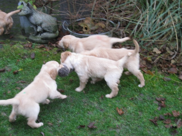 Es wird immer turbulenter in unserem Haus. Die Bande wächst und gedeiht und heckt immer mehr Unfug aus. Schade das das Wetter so nass ist, so kann die Bande immer nur kurz in den Garten. Je öfter sie im Garten waren, um so mehr jammern sie danach. Gott sei Dank haben wir unsere großen Mädel, sie beschäftigen die Kleinen wo sie nur können und dürfen. Ich habe auch wieder kleine Videos von dem Treiben...kann sie im Moment leider nicht hochladen, unser PC hat eine Macke und stürzt regelmässig ab....ich arbeite daran. Für diese Woche, Sonntag der 1.1.12 stand auch der Babytest an, leider kam alles anders als geplant....das Wetter so schlecht, das Gelände für den Test stand unter Wasser, wir hatten schon alles in den Wind geschrieben. Doch ab Mittags wurde es besser, es nieselte nur noch ganz leicht. Mein Mann und ich nahmen die Gelegenheit beim Schopf und nahmen den hinteren Teil unseres Gartens, den hatten die Welpen noch nicht gesehen. Normalerweise führen wir den Test nicht selber durch, aber die wiedrigen Umstände ließen uns keine andere Wahl. Die Welpen zeigten sich sehr zufriedenstellend, meine Beobachtungen während der sieben Wochen wurden bestätigt. Mein Mann hielt den Test fleissig in Bildern fest. Doch leider wurde beim Kopieren, auf unser externes Bilderlaufwerk, die Bilder von sieben Welpen gelöscht und da mein Mann den Kamerachip schon geleert hatte waren die Bilder endgültig verschwunden...ich hätte heulen können, mein Mann hatte sich so eine Mühe gemacht. Aber man kann es nicht ändern....dafür haben die Welpen überzeugt.