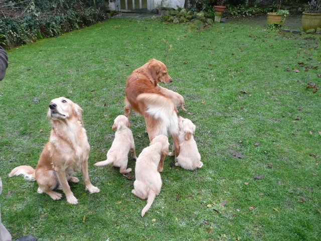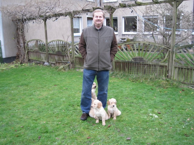 Da ich von der siebten Woche keine Bilder habe, nehme ich die Bilder von unserem heutigen ( Montag 2.1.12 ) Besuch noch mit hier rein. Beatrice Albrecht und Rob Groot, sie sind die Besitzer von Lachlann, wollten sich gerne die Kleinen anschauen. Da das Wetter es heute zu ließ, holten wir die Bande in den hinteren, trockeneren Teil des Gartens, den sie nur vom Babytest kannten. Du liebe Güte, da ging die Post ab...schlimmer als ein Sack Flöhe. Was wurde da alles untersucht, bis in die kleinsten Ecken mußten sie kriechen und dann kam auch noch ein fremder Hund dazu. Lachlann, der Papa der Kleinen gab sich ganz relaxt und ging sehr freundlich mit den Kleinen um. Nach anfänglichem vorsichtigem Beschnüffeln gingen die Rabauken in den Belagerungszustand über....alles kein Problem, Lachlann blieb ruhig und freundlich. Selbst unsere großen Mädels, die den Rüden schon mal ihre Meinung sagen, blieben ruhig und verhielten sich Lachlann gegenüber ganz neutral. Es war ein sehr schöner harmonischer Nachmittag und Rob und Beatrice waren auch sehr zufrieden mit Merles und Lachlanns Kindern. Nach einiger Zeit wurde die Bande müde und so brachten wir sie ins Haus. Hier wurde dann nur noch verhalten gespielt und so nach und nach legten die Kleinen sich zur Ruhe. Ich glaube sie werden von diesem Nachmittag rege träumen, haben sie doch so viel Neues erlebt. Ich möchte Euch auch daran teilnehmen lassen und so stelle ich die Bilder von dem schönen Nachmittag hier ein.
