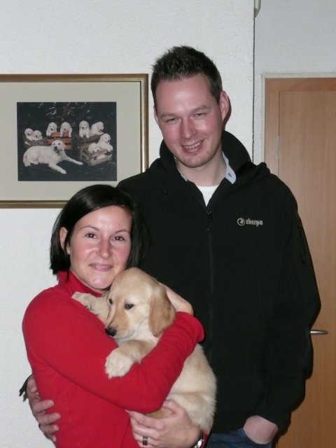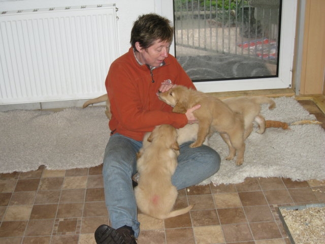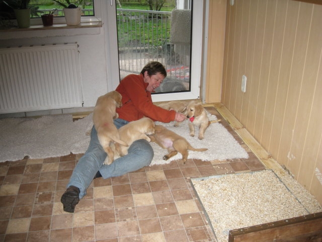 Nun sind sechs unserer Welpen in ihren neuen Familien...aber der Reihe nach. Vorher stand ja noch der Tierarztbesuch mit Impfen und Chippen an. Die Fahrt verlief relativ ruhig, 2-3 Kameraden meinten, sie müssten gegen das Radio ansingen, sie haben aber nach kurzer Zeit aufgegeben und sich ruhig zusammengerollt. Beim Tierarzt war schon alles vorbereitet und da wir wieder in der Mittagspause da waren, mussten die Mitarbeiterinnen die Kleinen erst einmal knuddeln, was diese natürlich mit Freuden annahmen. Nun ging alles zügig, Untersuchung, Impfen und Chippen und da alle sehr tapfer waren und keinen Laut von sich gaben, wurden sie mit einem Leckerchen belohnt. Nach kurzer Zeit ging es auch schon wieder Richtung Heimat. Zu Hause angekommen wurde erst einmal ausgiebig getobt, bevor sich die Bande zur Ruhe begab. Freitag den 6. 1. stand die Wurfabnahme an. Diese verlief sehr zufriedenstellend....auf beiden Seiten :-) Die Welpen, sie hatten sich vorher so richtig ausgespielt, waren bei der Kontrolle ruhig und ließen alles mit sich anstellen....abtasten, Zahnkontrolle und was sonst noch dazu gehört, alles wurde ohne Protest hingenommen. So stand dann auch in der Beurteilung zum Verhalten der Welpen : zutraulich, lebhaft ausgeglichen. Zur Bemerkung Mutterhündin/Welpen/Aufzucht: Mutterhündin in gutem Gesundheitszustand, Welpen: sehr homogener schöner und zutraulicher Wurf. Liebevolle und sachverständige Aufzucht!....was will man mehr Smile