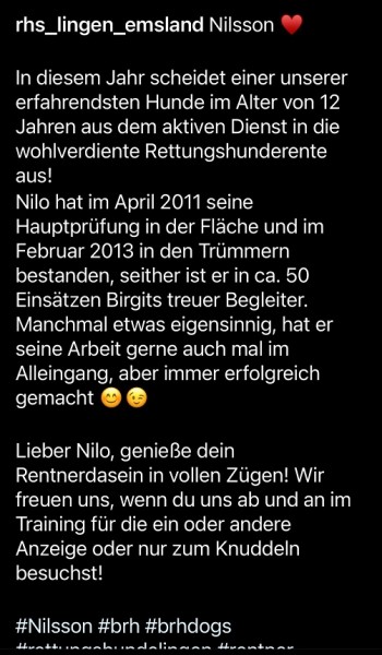 Danke Birgit für die Überlassung des Schreibens von eurer Hundestaffel und der Fotos. Ich finde es sehr schön wie sie über Euch, bzw, Nilsson geschrieben haben. Ihr seid mit ganzem Herzblut bei der Rettung und nun überlässt Nilsson die Einsätze Uras. Nach so vielen erfolgreichen Jahren darf Nilsson sein Rentnerleben in vollen Zügen genießen und sich verwöhnen lassen.