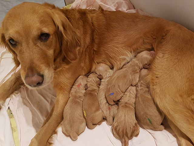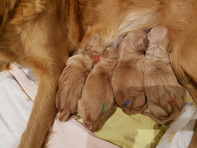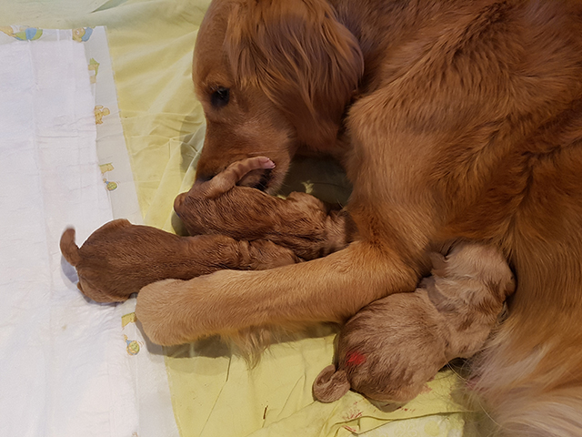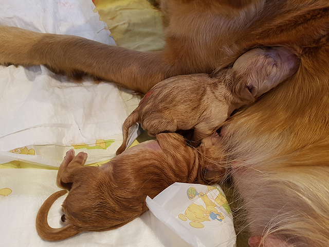 Pünktlich am 63. Tag brachte Sunny ihre Welpen zur Welt. Am Vorabend blieb das Thermometer auf 36,8° Grad stehen, ein Zeichen das bald die Geburt beginnt. Die Nacht verlief ruhig, Sunny lag ganz entspannt neben meinem Bett. Die Temperatur am Sonntagmorgen stand dann bei 37° Grad....es könnten Sonntagskinder werden. Die Morgenmahlzeit wurde dann auch nur bis zur Hälfte verspeist. Ansonsten zeigte Sunny nur durch ihre erhöhte Lauferei...raus in den Garten rein in die Wohnung, nach ein paar Minuten wieder raus und wieder rein, die Geburtsvorbereitungen an. Im Garten suchte sie einen geeigneten Platz um eine Höhle zu graben, aber keine Ecke war für sie richtig. Meine Einschätzung zu meinem Mann..es könnte noch am Abend losgehen. Der Beginn einer leichten aber anhaltenden Hechelei zeigte den Start der Geburt an. Plötzlich war Sunny verschwunden und ich fand sie im Welpenzimmer, sie hatte sich in die Wurfkiste gelegt. Das war für mich neu, jeder 1. Welpe unserer bisherigen Würfe wurde in den Hundebetten geboren. Um 18:00 Uhr setzte ich mich zu ihr und konnte nun auch die ersten Presswehen erkennen. Um 18:35 Uhr wurde der erste Rüde geboren. Kaum hatte Sunny ihn ausgepackt, begann er die Milchleiste zu suchen und protestierte lautstark wenn Sunny ihn immer wieder mit ihrer Zunge vom Weg abbrachte. Die erstgeborenen Welpen haben es auch schwer, bekommen sie doch die absolute Fürsorge der Mutter zu spüren ;-)) In einem ruhigen Moment konnten wir ihn versorgen, wiegen und kontrollieren ob an ihm alles in Ordnung ist...er brachte 460g auf die Waage. Nun ging es aber auch schon zügig weiter und der nächste Rüde erblickte das Licht der Welt. Nach dem dritten Rüden wurde es uns etwas mulmig, sicher freuten wir uns auf gesunde Welpen, aber es sollten dann doch auch noch die ein oder andere Hündin kommen. Um 20:00 Uhr kam dann ein Mädel...ach wie schön. Nach einer kurzen Verschnaufpause kam der 4. Bub auf die Welt...vielleicht, so hofften wir, wird der 6. Welpe ja noch ein Mädel...6 Welpen hatten wir auf dem Röntgenbild vor der Geburt gesehen. Dann der 6. Welpe...wieder ein Bub. Klar hätten wir uns noch über ein Mädel gefreut aber eine reibungslose Geburt, wo Mutter und Kinder wohlauf sind, ist goldwert. Und so freuen wir uns über unseren...besser gesagt, über Sunnys Sixpack und auf eine sorgenfreie Aufzucht.