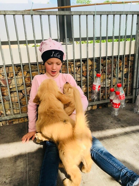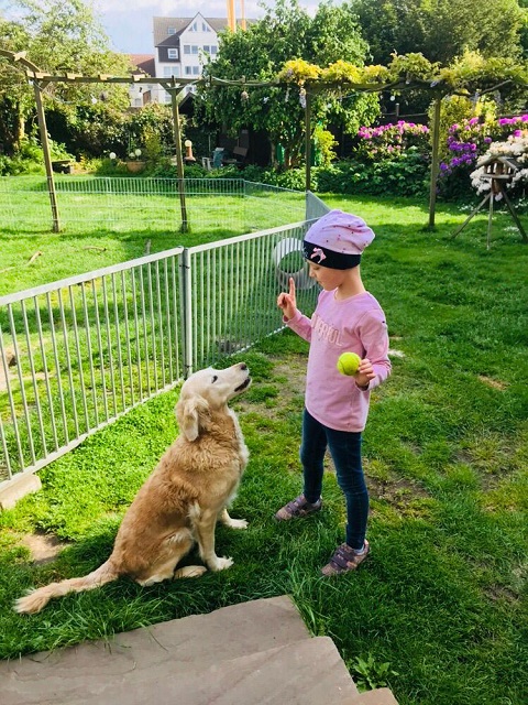 Zu Hause angekommen wurde erst einmal gebalgt und die Morgenmahlzeit verputzt, danach wurde es dann ruhiger und jeder suchte seinen Schlafplatz auf. Am Nachmittag hatte sich Anne mit ihrer Tochter zu einem Besuch angemeldet. Ida war wieder für die Welpen ein begehrter Spielpartner. Die Welpen, von der Impfung etwas verhaltener, machten es Ida leicht am Boden zu sitzen. Als sich die Bande wieder zurückzog musste Ida unseren Grossen erst noch ein paar Tennisbälle werfen. Die Mädels gingen begeistert darauf ein...wo doch sonst die Welpen im Vordergrund stehen. Selbst Merle mit ihren 11 1/2 Jahren sprang über den Metallzaun um eher an den Ball zu kommen als Sunny, die durchs Törchen lief :-)))