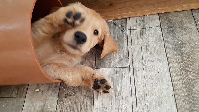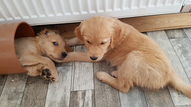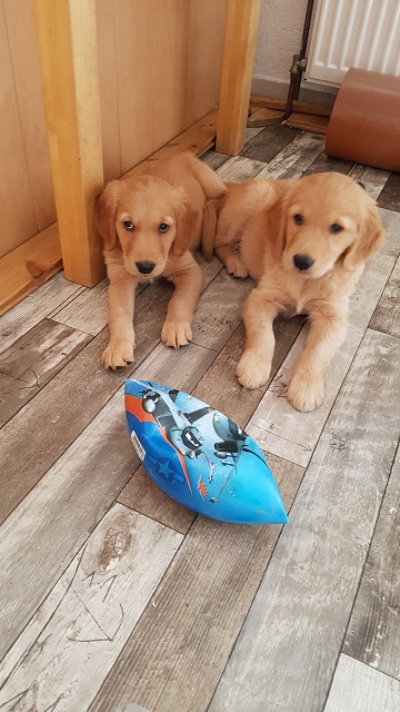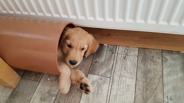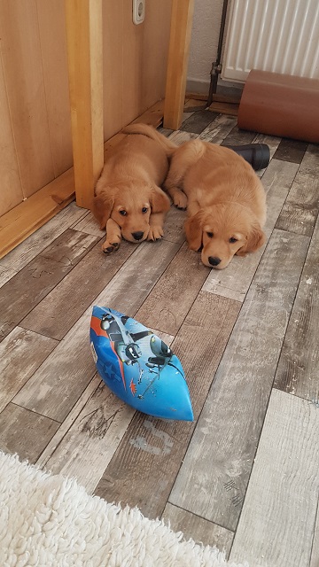 Der Montag verlief dann etwas angespannt bei uns. Yule hatte am Sonntagabend Durchfall und am Montag war sie total lustlos, reagierte auf keinerlei Spielaufforderung der Geschwister, verweigerte das Futter und selbst die Milchbar ihrer Mutter, konnte sie nicht zum Trinken animieren... wie man auf dem oberen Video sehen kann, Yule liegt links in der Box. Als ich mich entschied mit ihr zum Tierarzt zu fahren, sah ich sie am Wassernapf stehen und Wasser trinken...Gott sei Dank, die Welpen reagieren ja sehr schnell mit Austrocknung wenn sie Durchfall haben. Ich entschied dann nicht zu fahren und sie einfach im Auge zu behalten. Spät am Abend sah ich sie dann wieder mit den Geschwistern herumbalgen, ich war so froh. Was ich an der Geschichte süss fand, der rote Rüde ist ihr am Montag kaum von der Seite gewichen, leckte ihr Schnäuzchen oder legte sich einfach nur neben sie. Die Beiden haben aber schon von Anfang an eine Beziehung miteinander. Er hat sie auch schon gegen ihre Brüder verteidigt, wenn diese zu rau mit ihr umgingen...ohne zu wissen, dass sie vorher auch ausgeteilt hatte.