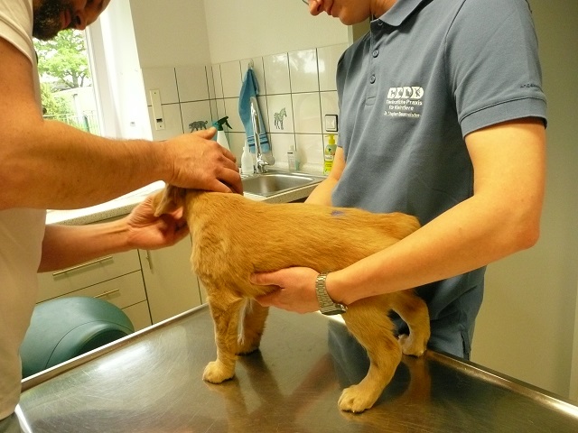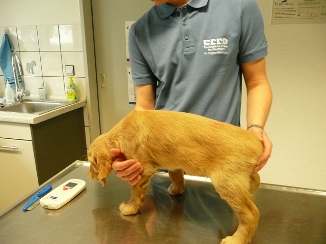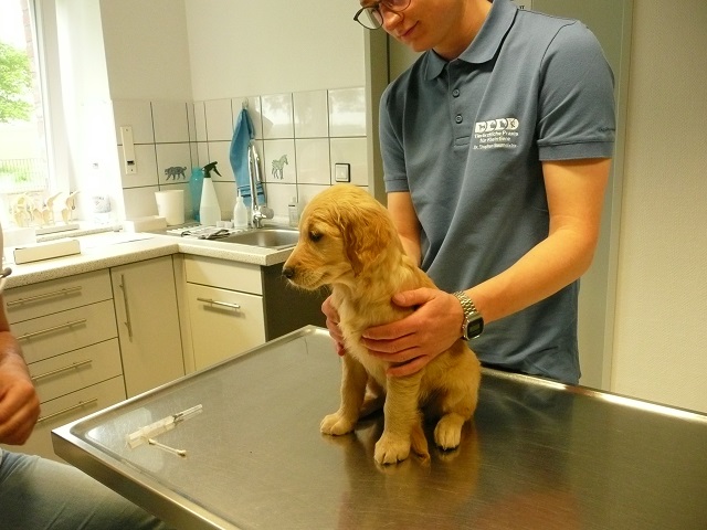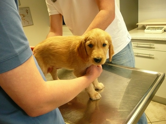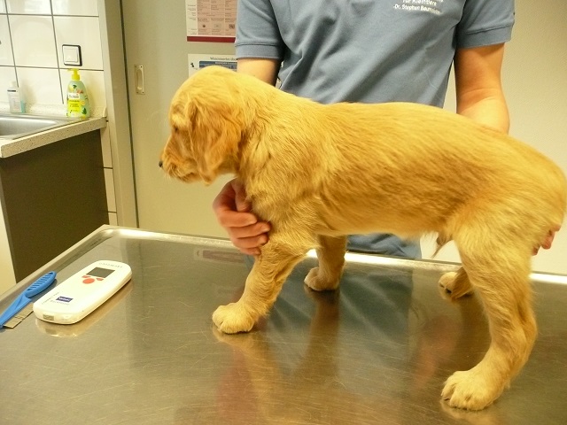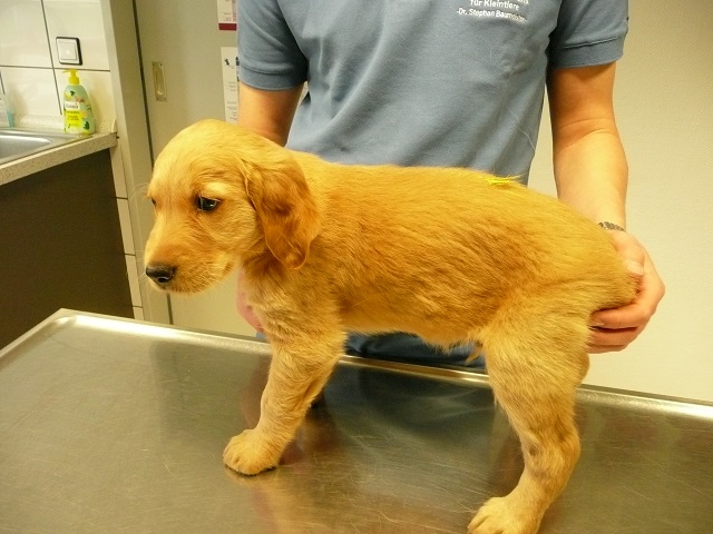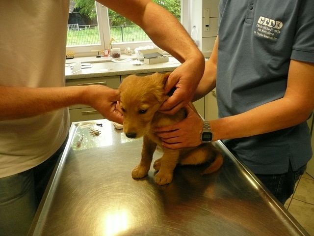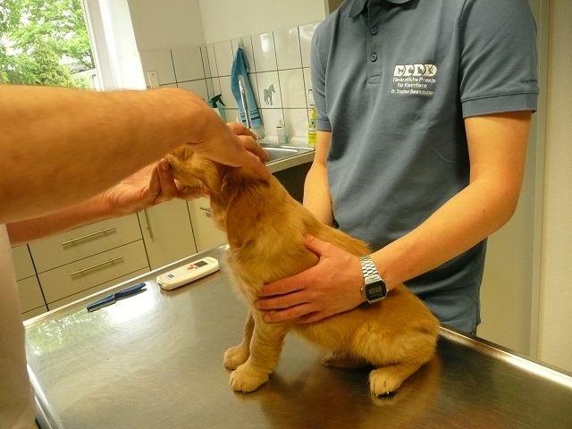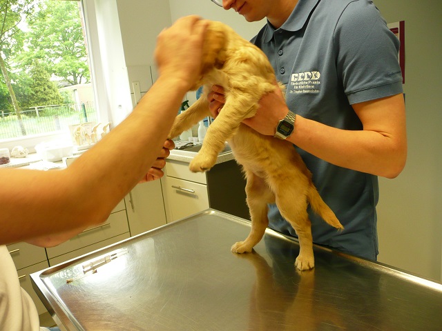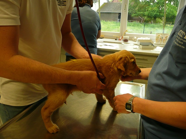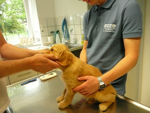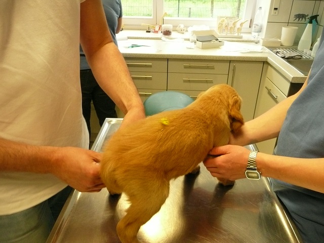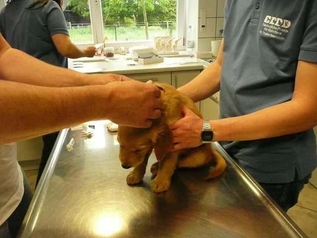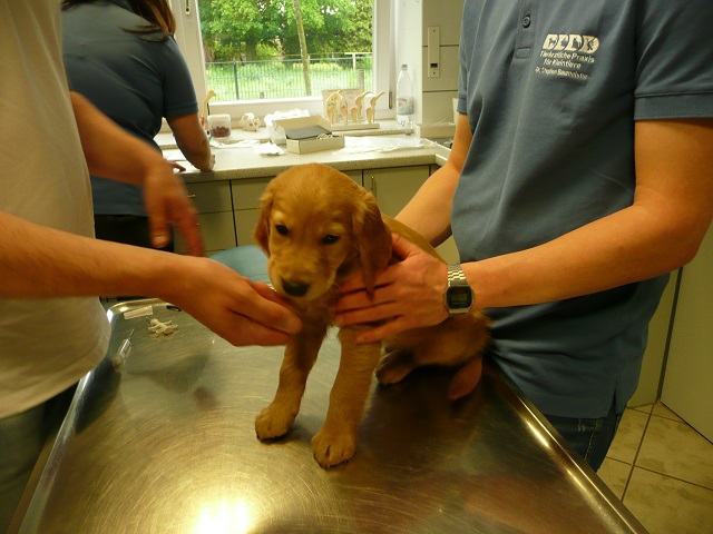 Da wir dann doch sehr zeitig bei unserem Doc in Hamm ankamen, hatten sie Zeit die Kotprobe zu untersuchen...Entwarnung, keinerlei Parasiten und besonders keine Giardien...was war ich froh. Nun konnte es losgehen. Ein Welpe nach dem Anderen mussten wir aus ihrem Spiel reissen...das hatten wir auch noch nicht, Welpen die im Kennel spielen :-)) Die Untersuchung verlief erfreulich, es gab keinerlei Beanstandungen. Zähne, Augen und Ohren okay, Zustand der Welpen okay...obwohl Yule durch ihren schlechten Tag einiges an Gewicht verloren hatte, sah der Doc keinen Grund sie nicht zu Impfen. Kondition war bei Allen super. Als wir mit allen Welpen fertig waren meinte der Doc, selten Welpen mit so einem ruhigen Herzschlag...in keiner Weise aufgeregt bei der Untersuchung...echt cool!!! Zum Schluss sah er sich Sunny an aber auch bei ihr war alles in bester Ordnung.