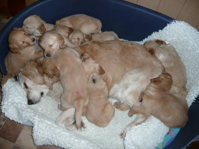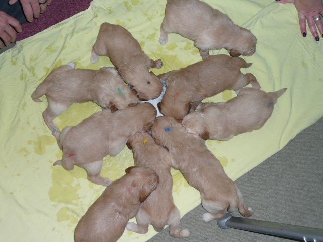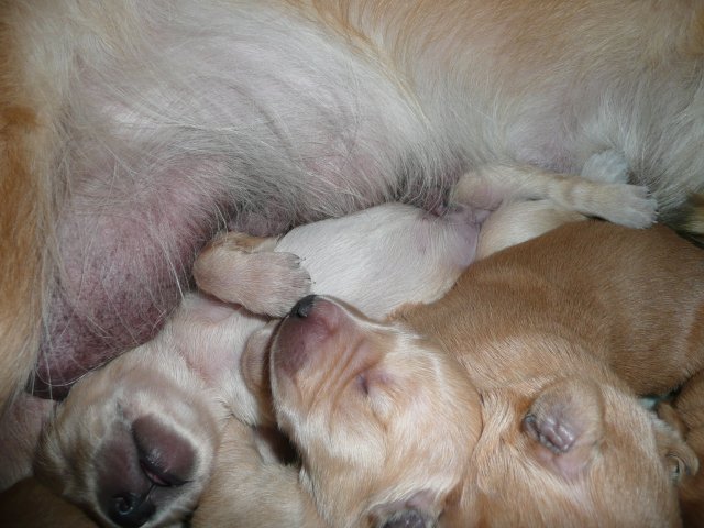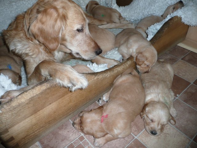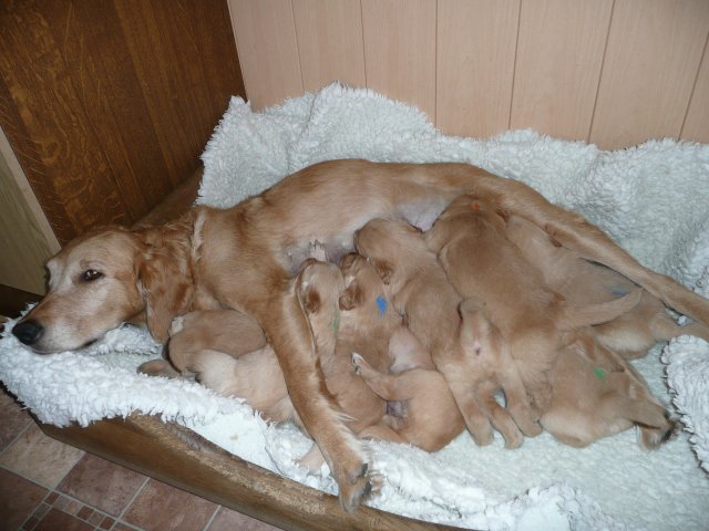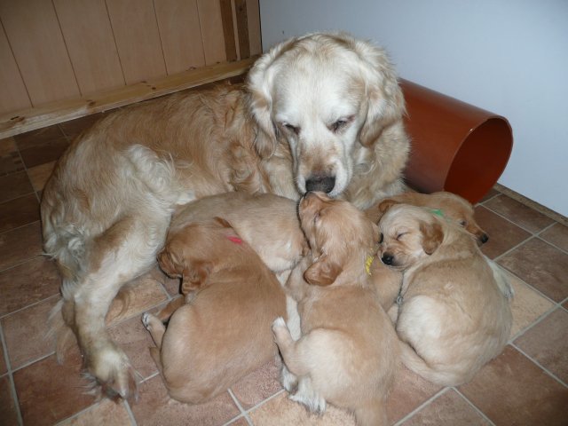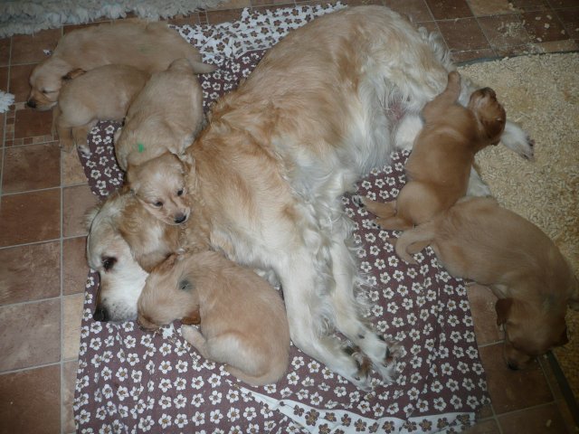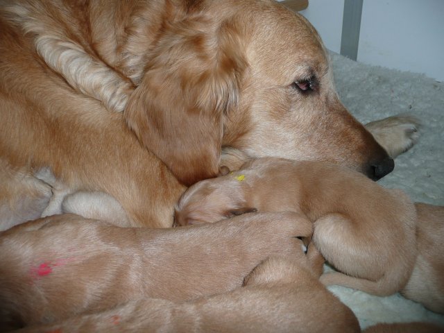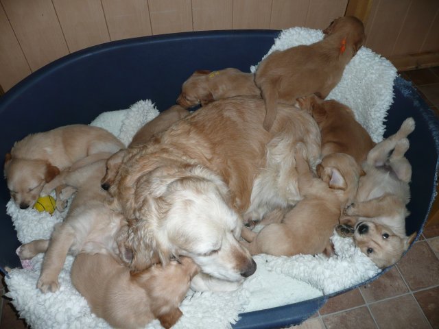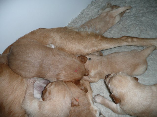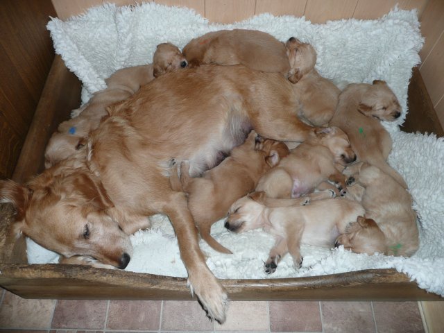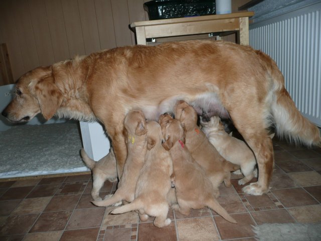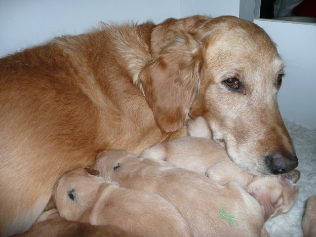 Der Samstag Morgen begann bei uns um 5:30 Uhr, raus in den Garten....rein in die Wohnung...zwei Runden um den Tisch...raus in den Garten.....hier mal ein bisschen buddeln und da mal ein bisschen buddeln....rein in die Wohnung und gehechelt wurde schon heftig. Als dann die Sonne höher stieg, konnte ich es mir auf unserer Terasse bequem machen und so hielten wir uns den ganzen Vormittag draussen auf und genossen den schönen sonnigen Tag. Als der Mittag kam, dachte ich...*es kann ja mal bald losgehen* aber ausser Rennerei und Hechelei tat sich noch nichts und so setzte ich mich wieder in die Sonne und beobachtete die werdende Mutter. Ich wollte Merle nicht alleine lassen, das verrückte Luder wollte doch in ihrem Zustand über unseren Zaun im Garten springen. Der Zaun trennt den Hundegarten vom Menschengarten, damit nicht alles durchwühlt wird, er ist 1,50m hoch und Merle geht im normalen Zustand aus dem Stand herüber....aber mit ihrem Bauch mußte das ja nicht sein. Also sitzen und warten....der Nachmittag kam, es wurde schon wieder dämmrig, dann dunkel und so langsam gab ich die Hoffnung auf eine Geburt am Tage auf. Zwischen der Rennerei und Hechelei legte Merle sich in ihre Hundekiste, schlief tief und fest und von Wehen war nichts zu sehen. Mein Mann und ich legten uns abwechselnd hin um wenigstens etwas Ruhe zu finden. Um 2:00Uhr ging es dann so langsam los, das erste Fruchtwasser ging ab, Merle lag fest in ihrer Kiste und ich konnte die erste Wehentätigkeit sehen....Gott sei Dank, es geht los. So kam dann um 3:50 Uhr die erste Hündin zur Welt. Merle ganz instinktsicher wußte sofort was sie zu tun hatte, sie packte den Welpen aus und kaute die Nabelschnur durch und leckte und leckte. Der arme Wurm, ich hatte schon Bedenken ob er überhaupt noch Fell am Körper hatte ;-) Bevor die nächsten Wehen einsetzten, brachte ich Mutter und Kind in die Wurfkiste, wo etwas mehr Platz zur Verfügung stand. Nun ging es ganz zügig weiter. Merle machte ihre Sache hervorragend und versorgte jeden Welpen mit großer Hingabe. Mein Mann und ich ließen sie gewähren und hielten uns so ziemlich zurück. Ich sorgte stets für eine trockene Unterlage und so nach und nach kontrollierten wir die Welpen ob alles ok ist und notierten uns ihre Gewichte. Nach dem siebten Welpen machte Merle etwas über eine Stunde Pause. Da wir beim Ultraschall 8 Welpen gesehen hatten, wußte ich, es müsste noch einer kommen. Ich tastete den Bauch ab und sagte zu meinem Mann *ich schätze, es könnten auch noch 2 sein*. So war es dann auch, die letzten Zwei, purzelten kurz nacheinander in die Wurfkiste. Nun konnte ich an Merles Verhalten sehen....sie war fertig. Sie durfte sich einmal im Garten die Beine vertreten und ich richtete in der Zeit die Wurfkiste her. Ich hatte gerade so viel Zeit die Welpen noch einmal zu kontrollieren, da war Merle schon wieder zurück . Nun liegt sie entspannt bei ihren Kindern und geht in ihrer Mutterrolle total auf. Es ist ein herrliches Bild und erfüllt uns immer wieder mit tiefer Dankbarkeit und Freude.