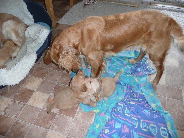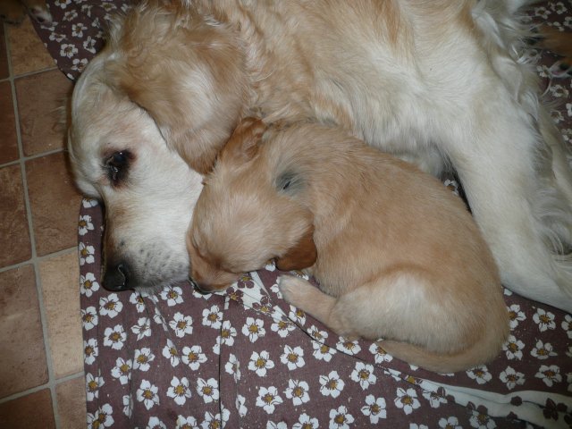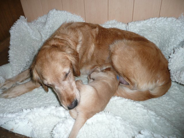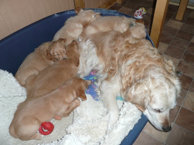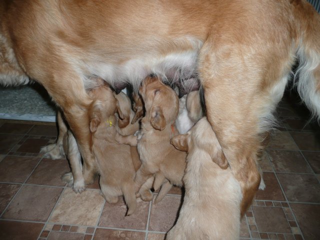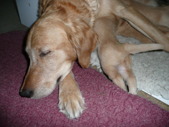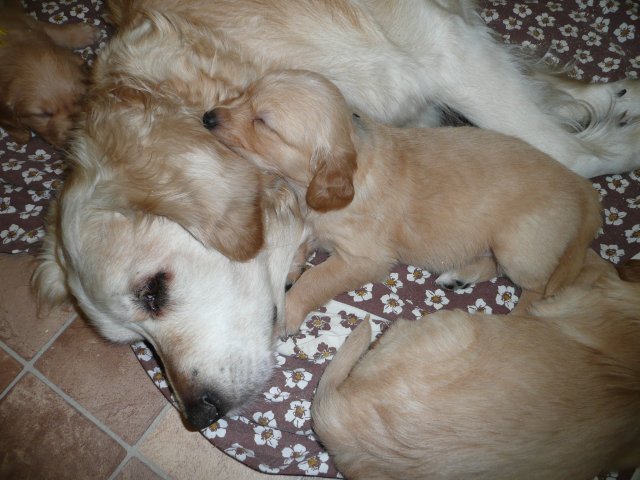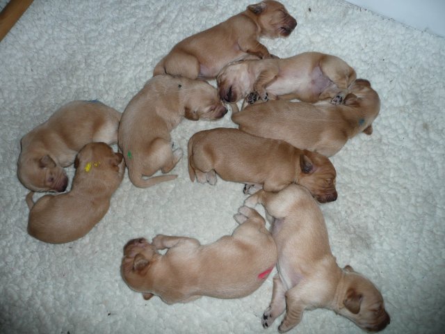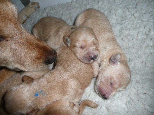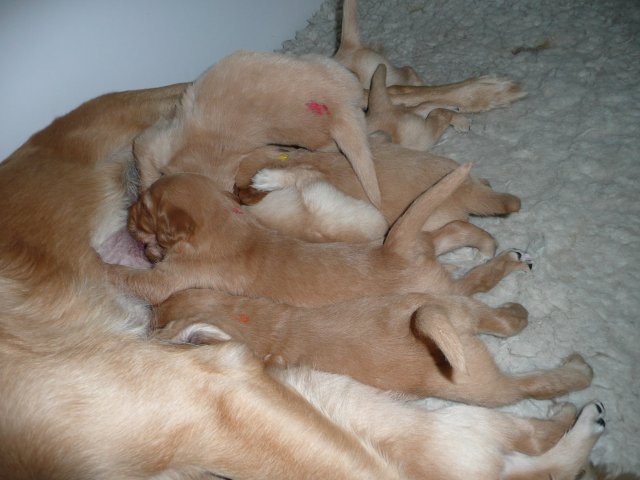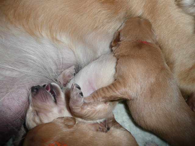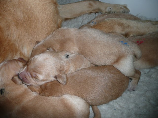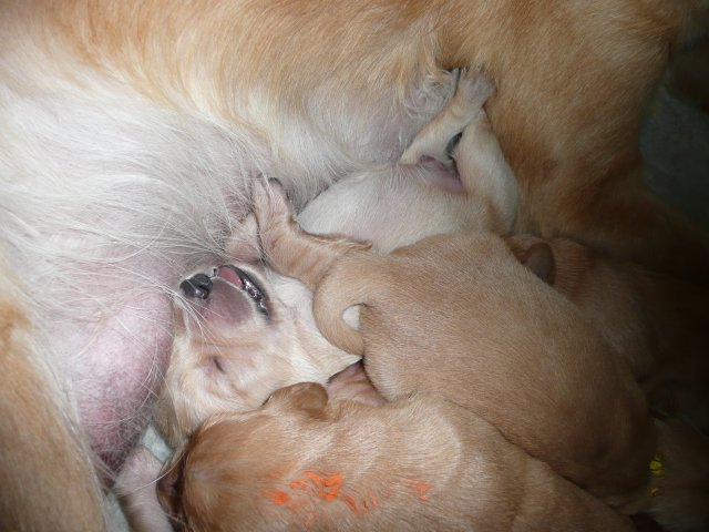 Der Samstag Morgen begann bei uns um 5:30 Uhr, raus in den Garten....rein in die Wohnung...zwei Runden um den Tisch...raus in den Garten.....hier mal ein bisschen buddeln und da mal ein bisschen buddeln....rein in die Wohnung und gehechelt wurde schon heftig. Als dann die Sonne höher stieg, konnte ich es mir auf unserer Terasse bequem machen und so hielten wir uns den ganzen Vormittag draussen auf und genossen den schönen sonnigen Tag. Als der Mittag kam, dachte ich...*es kann ja mal bald losgehen* aber ausser Rennerei und Hechelei tat sich noch nichts und so setzte ich mich wieder in die Sonne und beobachtete die werdende Mutter. Ich wollte Merle nicht alleine lassen, das verrückte Luder wollte doch in ihrem Zustand über unseren Zaun im Garten springen. Der Zaun trennt den Hundegarten vom Menschengarten, damit nicht alles durchwühlt wird, er ist 1,50m hoch und Merle geht im normalen Zustand aus dem Stand herüber....aber mit ihrem Bauch mußte das ja nicht sein. Also sitzen und warten....der Nachmittag kam, es wurde schon wieder dämmrig, dann dunkel und so langsam gab ich die Hoffnung auf eine Geburt am Tage auf. Zwischen der Rennerei und Hechelei legte Merle sich in ihre Hundekiste, schlief tief und fest und von Wehen war nichts zu sehen. Mein Mann und ich legten uns abwechselnd hin um wenigstens etwas Ruhe zu finden. Um 2:00Uhr ging es dann so langsam los, das erste Fruchtwasser ging ab, Merle lag fest in ihrer Kiste und ich konnte die erste Wehentätigkeit sehen....Gott sei Dank, es geht los. So kam dann um 3:50 Uhr die erste Hündin zur Welt. Merle ganz instinktsicher wußte sofort was sie zu tun hatte, sie packte den Welpen aus und kaute die Nabelschnur durch und leckte und leckte. Der arme Wurm, ich hatte schon Bedenken ob er überhaupt noch Fell am Körper hatte ;-) Bevor die nächsten Wehen einsetzten, brachte ich Mutter und Kind in die Wurfkiste, wo etwas mehr Platz zur Verfügung stand. Nun ging es ganz zügig weiter. Merle machte ihre Sache hervorragend und versorgte jeden Welpen mit großer Hingabe. Mein Mann und ich ließen sie gewähren und hielten uns so ziemlich zurück. Ich sorgte stets für eine trockene Unterlage und so nach und nach kontrollierten wir die Welpen ob alles ok ist und notierten uns ihre Gewichte. Nach dem siebten Welpen machte Merle etwas über eine Stunde Pause. Da wir beim Ultraschall 8 Welpen gesehen hatten, wußte ich, es müsste noch einer kommen. Ich tastete den Bauch ab und sagte zu meinem Mann *ich schätze, es könnten auch noch 2 sein*. So war es dann auch, die letzten Zwei, purzelten kurz nacheinander in die Wurfkiste. Nun konnte ich an Merles Verhalten sehen....sie war fertig. Sie durfte sich einmal im Garten die Beine vertreten und ich richtete in der Zeit die Wurfkiste her. Ich hatte gerade so viel Zeit die Welpen noch einmal zu kontrollieren, da war Merle schon wieder zurück . Nun liegt sie entspannt bei ihren Kindern und geht in ihrer Mutterrolle total auf. Es ist ein herrliches Bild und erfüllt uns immer wieder mit tiefer Dankbarkeit und Freude.
