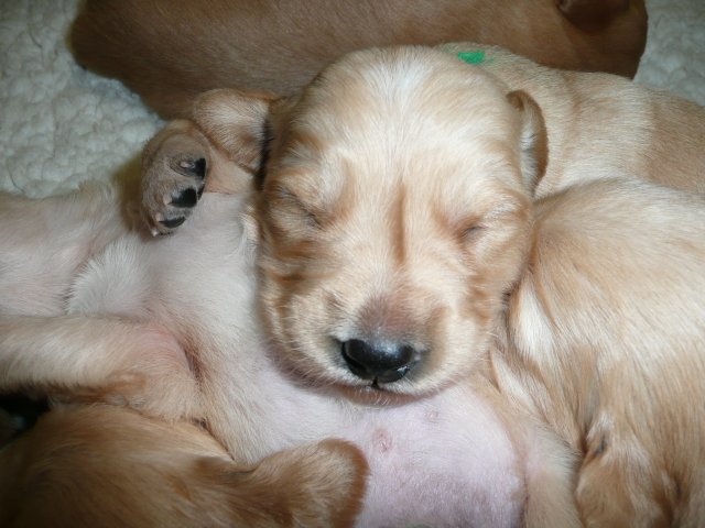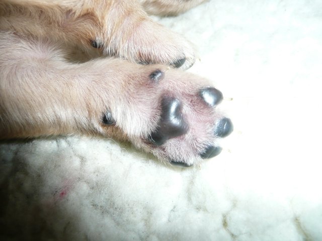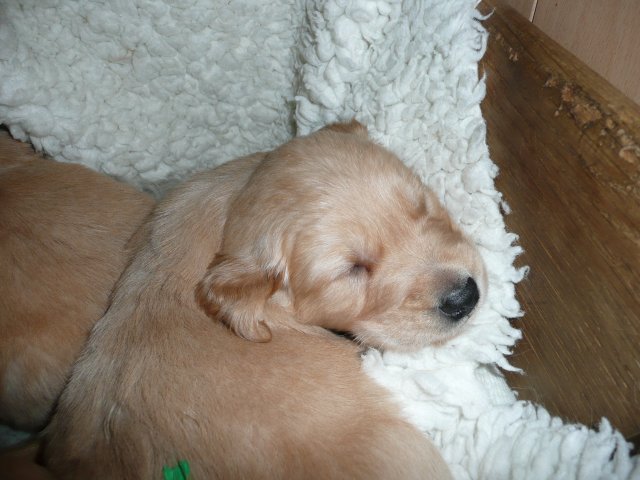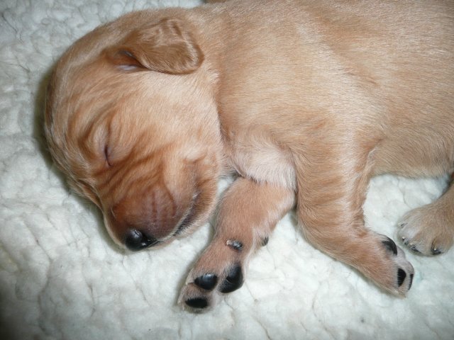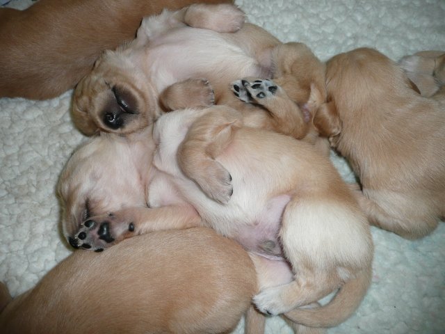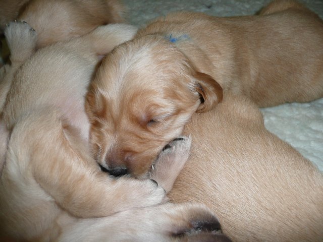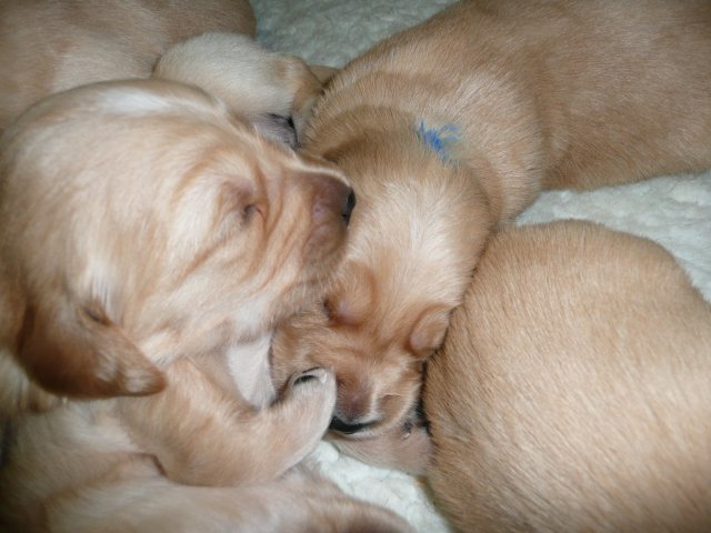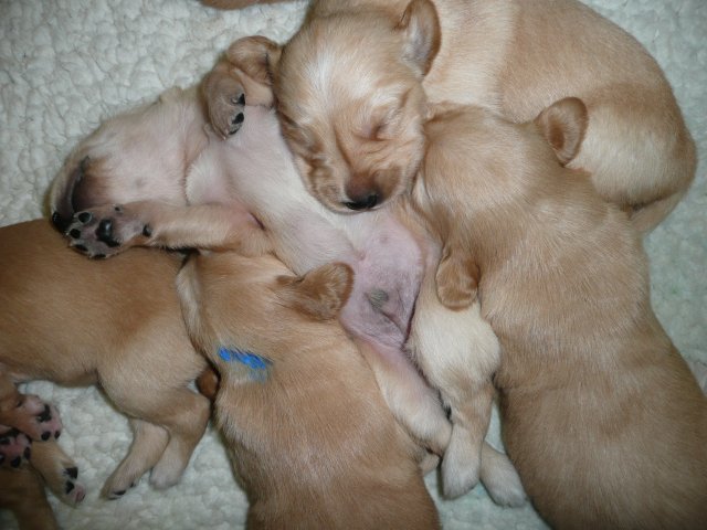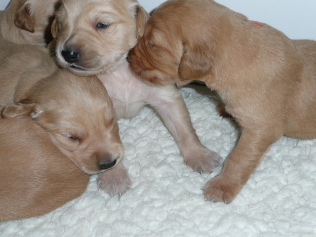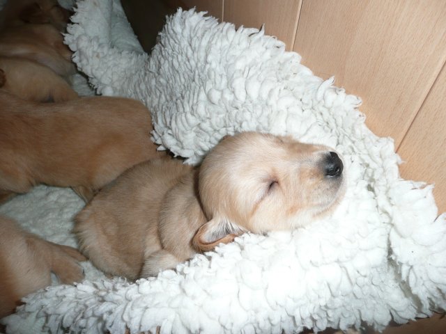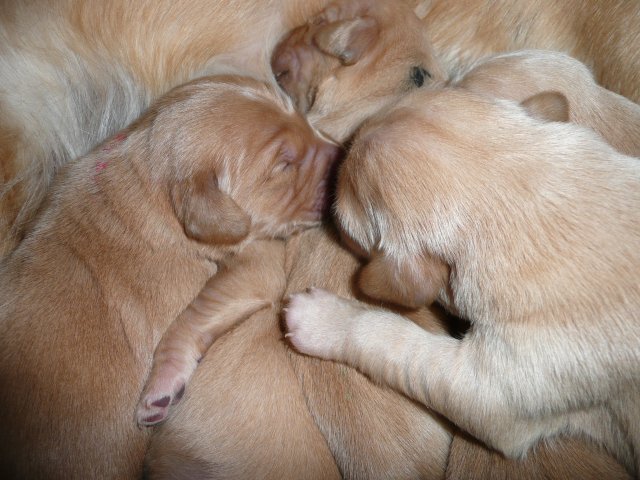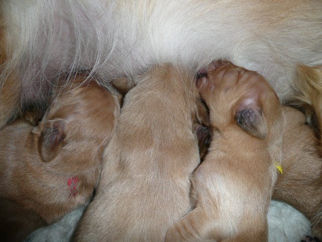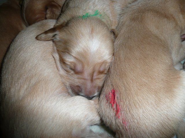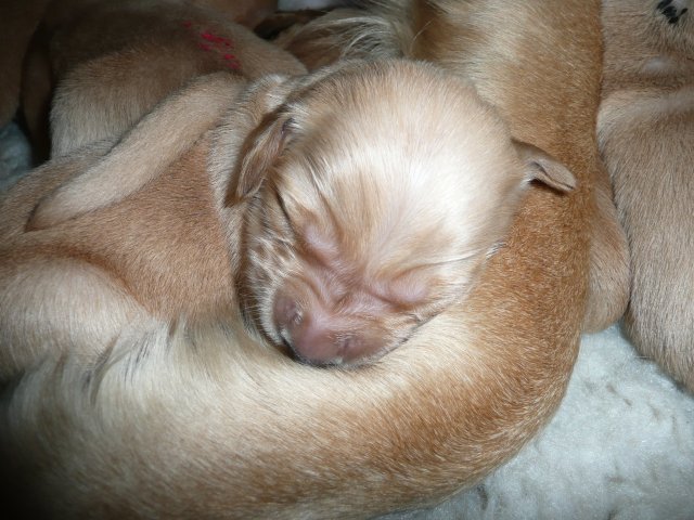 Ab dem 10. Lebenstag der Welpen konnte man beobachten, dass die Augen sich zu einem Spalt öffneten.....nun beginnt ein neuer Lebensabschnitt. Merle verbringt immer noch den überwiegenden Teil des Tages bei ihren Kleinen. Ab und an liegt sie auch schon mal ausserhalb der Wurfkiste aber sie bleibt freiwillig im Welpenzimmer. So hat sie die Kleinen besser im Blick. Mittlerweile haben alle Welpen die Augen geöffnet und Geräusche nehmen sie auch schon wahr. Am Besten ist der Geruchssinn ausgeprägt. Die kleinen Näschen nehmen sofort wahr, wenn ich neben der Kiste stehe oder wenn Merle von einem *Ausgang* wieder ins Welpenzimmer kommt, dann recken sie die Köpfchen in die Höhe und wackeln auf ihren Beinchen der Geruchsquelle entgegen. Ja noch können die Beinchen nicht so schnell wie Kleinen es wollen, aber von Tag zu Tag werden die Gehversuche sicherer. Mittlerweile können sie auch schon richtig Bellen und Heulen, besonders wenn Merle nicht schnell genug mit der Milchbar kommt. Um Merles Gesäuge zu schützen, mußte ich bei den Kleinen schon die Krallen schneiden....während ihrer Ruhephase ging es ganz gut. Die erste Wurmkur haben sie auch schon bekommen, was nicht so gut ankam....aber was sein muß, muß sein ;-)