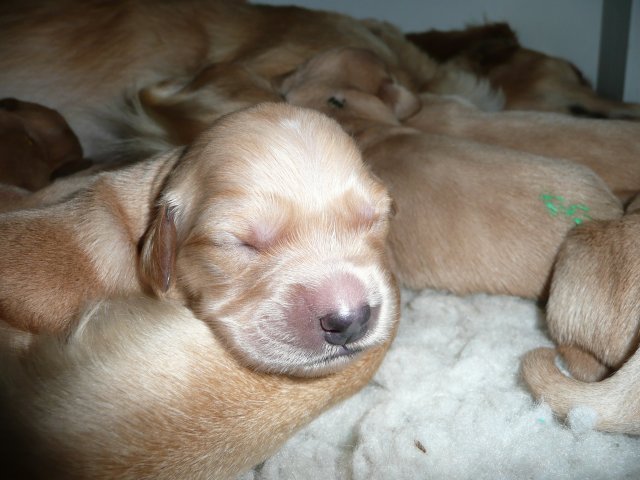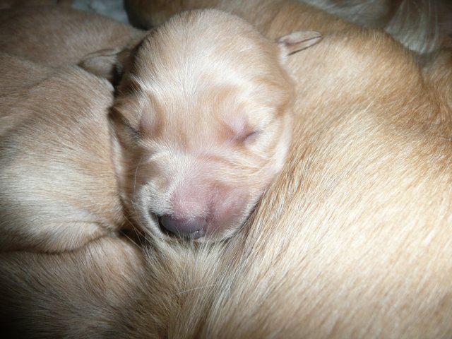 Nun sind die Kleinen schon eine Woche alt. Rein optisch hat sich nicht so viel getan, bis auf....sie sehen nicht mehr wie kleine Marzipanschnäuzchen aus, ihr Pigment hat sich sehr schön entwickelt...die Näschen sind pechschwarz und sie haben schwarze Lackschühchen angezogen. Sie sind recht rege und wenn sie satt sind, liegen sie ruhig und schlafen. Merle ist ihnen eine tolle Mutter und kümmert sich hervorragend um ihre Kinder, sobald sie ein Knüttern aus der Kiste hört, ist sie zur Stelle. Die Kleinen haben auch schon einen guten Geruchssinn, sobald Merle von ihrem Aussenaufhalt wieder ins Welpenzimmer kommt, heben sie die Näschen und versuchen in ihre Richtung zu robben. Also, wenn ich so recht bedenke, hat sich doch schon viel getan. Hier kommen die Fotos der ersten Woche.