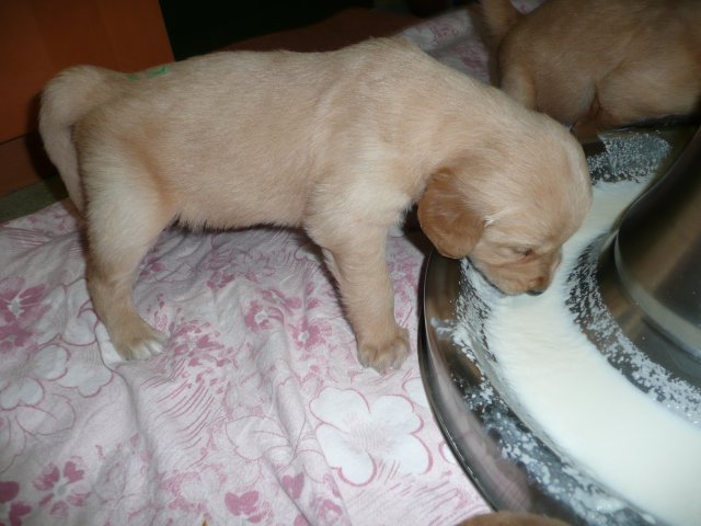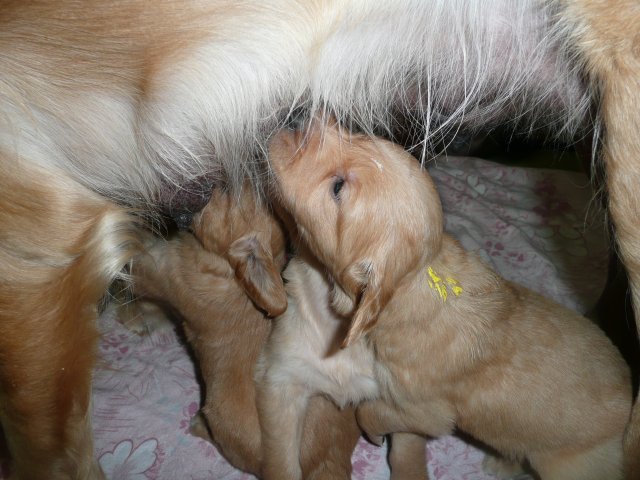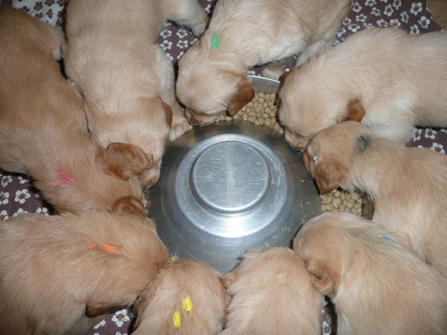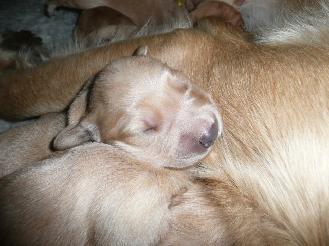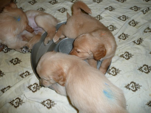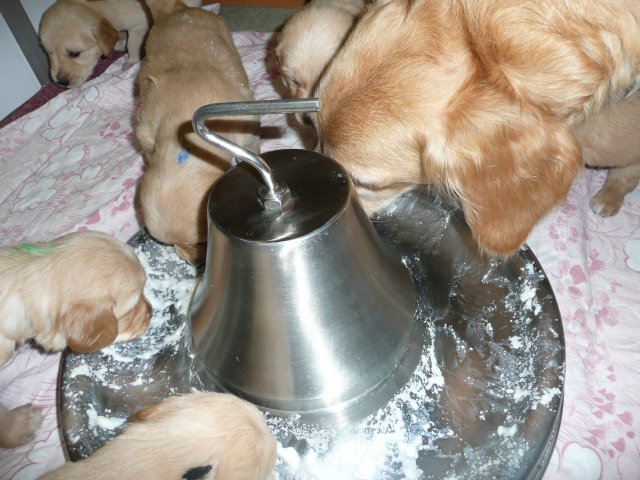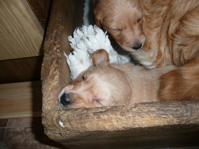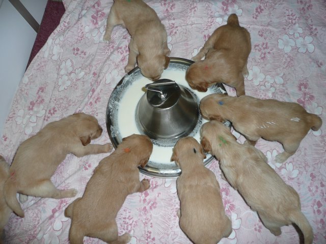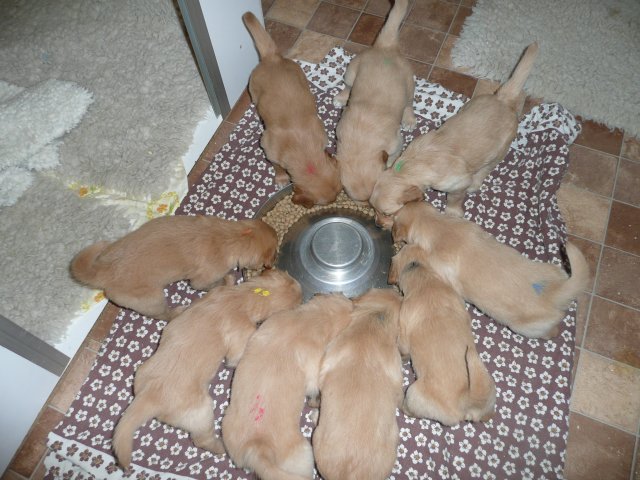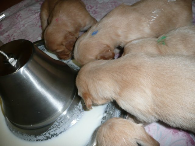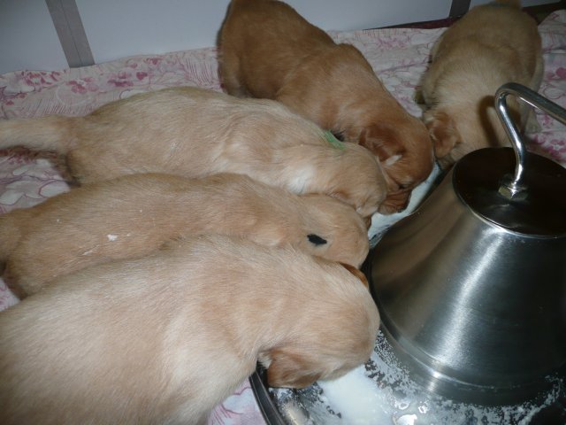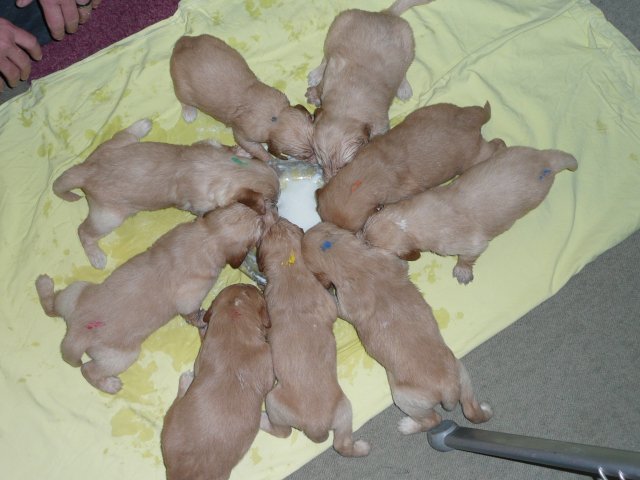 In der dritten Woche haben sich die Kleinen schön weiter entwickelt. Die Augen sind ganz auf, das Gehör funktioniert hervorragend und ihre Bewegungen sind sicher und flott. Wenn ich an die Wurfkiste komme und mit *Baby Baby* locke, kommen sie ganz schnell auf den kleinen Beinchen angesaust und hoffen auf etwas Trinkbarem oder freuen sich auch schon über Streicheleinheiten und quittieren diese mit wedelnden Ruten. Bei ihrem ersten *Aussenauslauf* wurde alles sehr genau untersucht, in jede noch so kleine Ecke mußten sie hineinkriechen. Als es wieder hiess, zurück in die Wurfkiste, war das Geschrei groß....einmal die weite Welt geschnuppert. Merle nimmt sich jetzt schon die ein oder andere Auszeit und beobachtet ihre Puppies aus sicherer Entfernung. Genau wie Genna bei ihrem letzten Wurf, so hat auch sie sich die Wäschewanne ausgesucht und fühlt sich sehr wohl darin. Die erste Milchmahlzeit schmeckte den Kleinen auch schon gut und sie wussten sofort wie sie die Milch am Besten aufnehmen konnten. Gestern habe ich die Milch noch Jedem einzeln angeboten, so durften sie heute alle zusammen aus einer Schale schlabbern. Gut das noch einige Hände mehr da waren, die die Welpen immer wieder aus dem Milchbad befreiten, aber am Ende waren die Bäuchlein rund und gut gefüllt. Sehr viel Bilder habe ich nicht von dieser Woche, die Bewegungsbilder sind leider alle unscharf aber dafür habe ich ein kleines Filmchen gedreht.