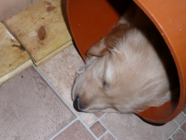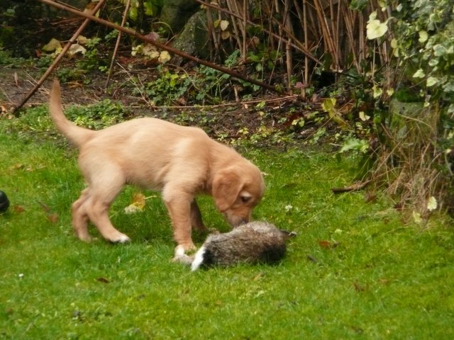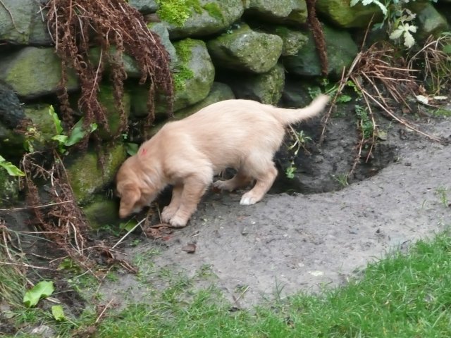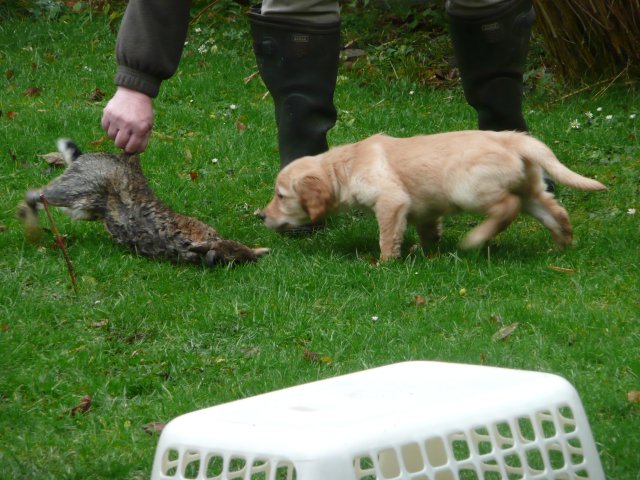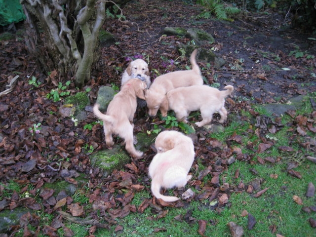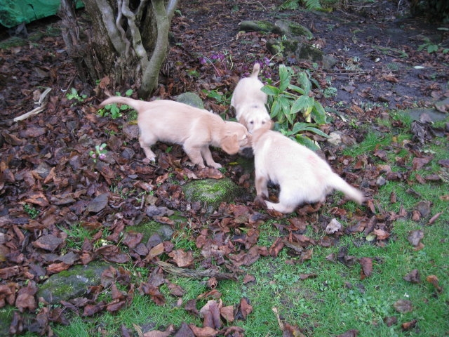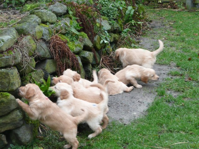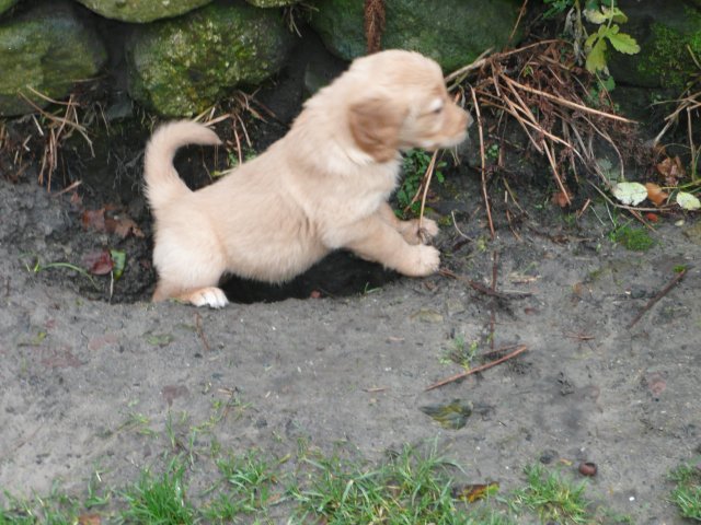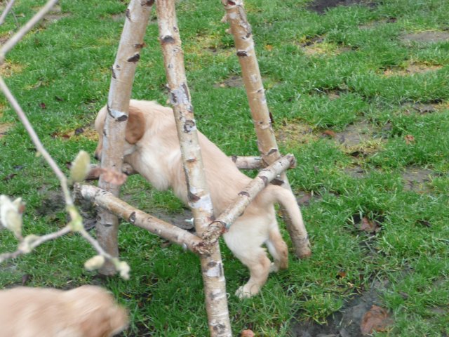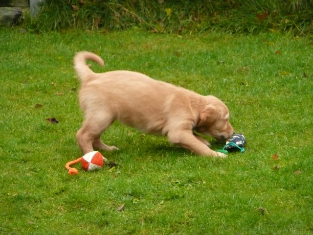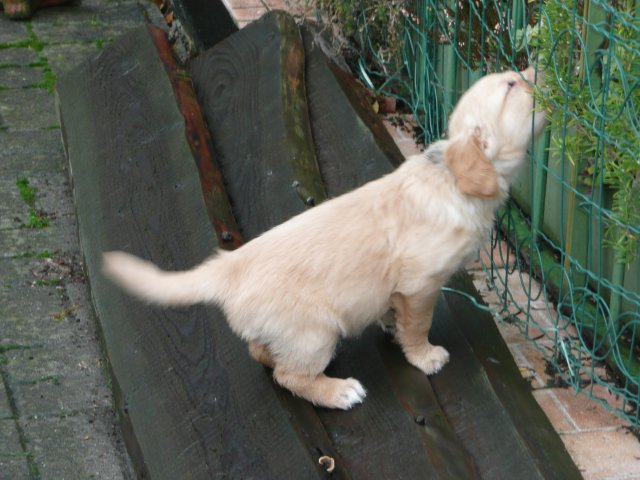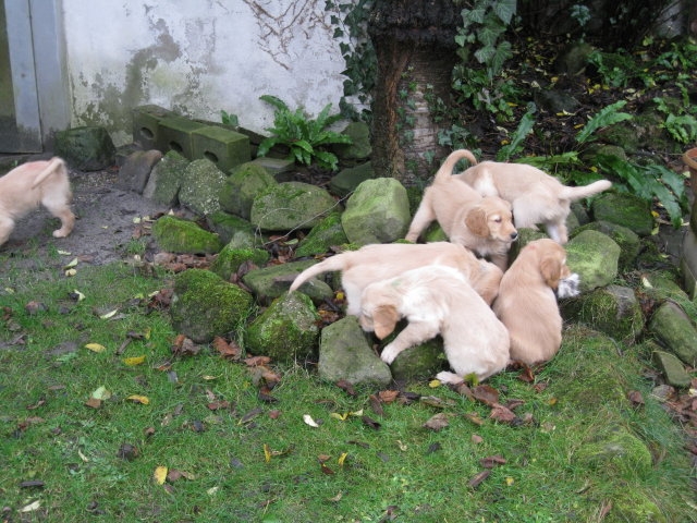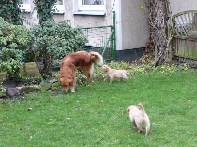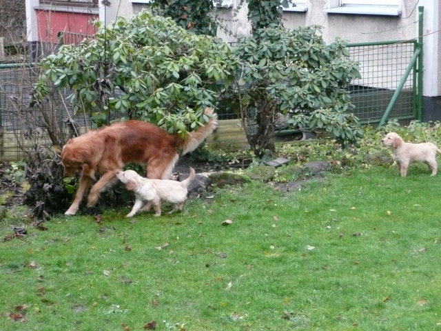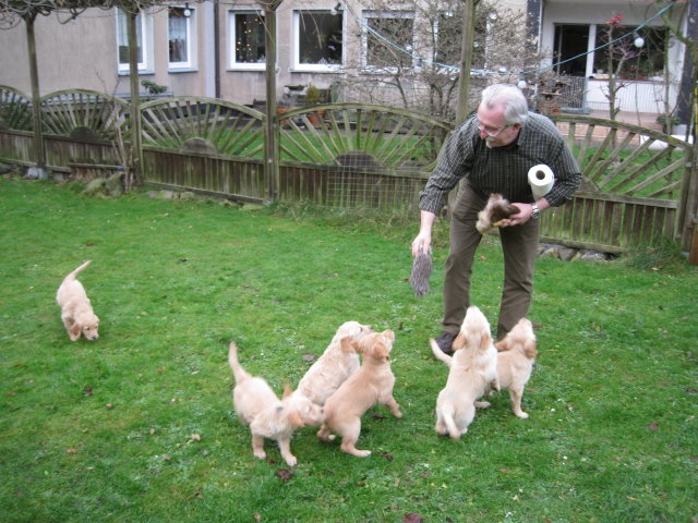Es wird immer turbulenter in unserem Haus. Die Bande wächst und gedeiht und heckt immer mehr Unfug aus. Schade das das Wetter so nass ist, so kann die Bande immer nur kurz in den Garten. Je öfter sie im Garten waren, um so mehr jammern sie danach. Gott sei Dank haben wir unsere großen Mädel, sie beschäftigen die Kleinen wo sie nur können und dürfen. Ich habe auch wieder kleine Videos von dem Treiben...kann sie im Moment leider nicht hochladen, unser PC hat eine Macke und stürzt regelmässig ab....ich arbeite daran. Für diese Woche, Sonntag der 1.1.12 stand auch der Babytest an, leider kam alles anders als geplant....das Wetter so schlecht, das Gelände für den Test stand unter Wasser, wir hatten schon alles in den Wind geschrieben. Doch ab Mittags wurde es besser, es nieselte nur noch ganz leicht. Mein Mann und ich nahmen die Gelegenheit beim Schopf und nahmen den hinteren Teil unseres Gartens, den hatten die Welpen noch nicht gesehen. Normalerweise führen wir den Test nicht selber durch, aber die wiedrigen Umstände ließen uns keine andere Wahl. Die Welpen zeigten sich sehr zufriedenstellend, meine Beobachtungen während der sieben Wochen wurden bestätigt. Mein Mann hielt den Test fleissig in Bildern fest. Doch leider wurde beim Kopieren, auf unser externes Bilderlaufwerk, die Bilder von sieben Welpen gelöscht und da mein Mann den Kamerachip schon geleert hatte waren die Bilder endgültig verschwunden...ich hätte heulen können, mein Mann hatte sich so eine Mühe gemacht. Aber man kann es nicht ändern....dafür haben die Welpen überzeugt.