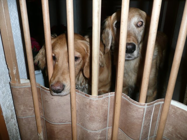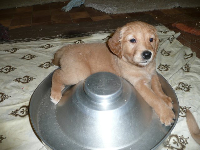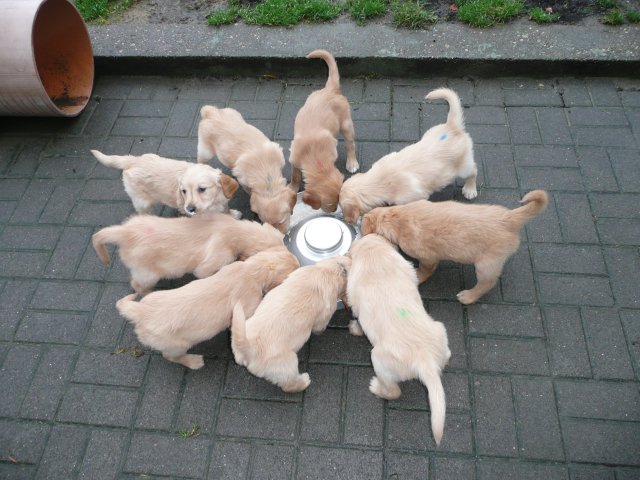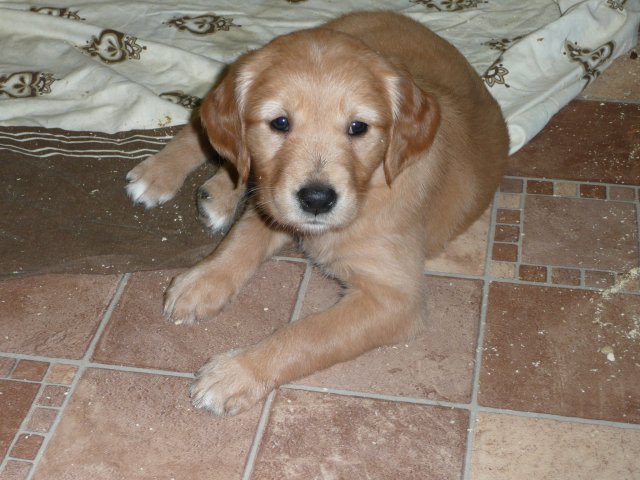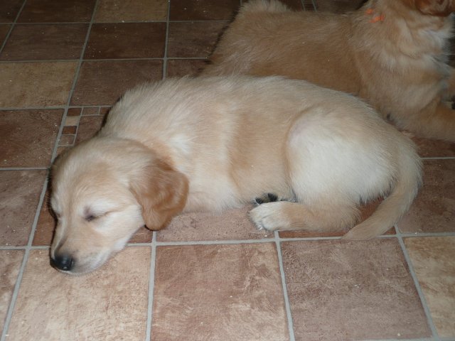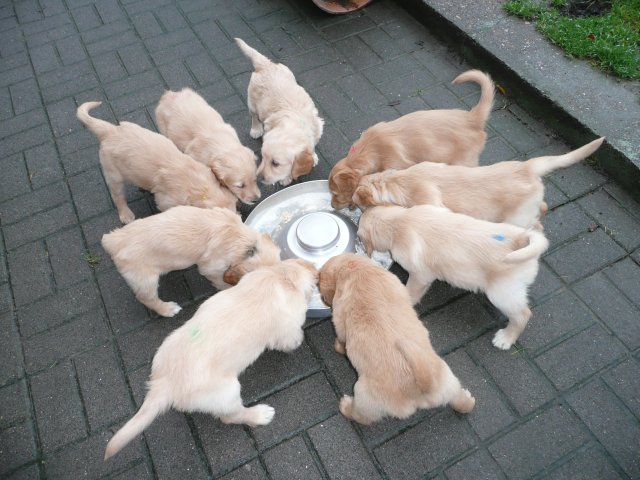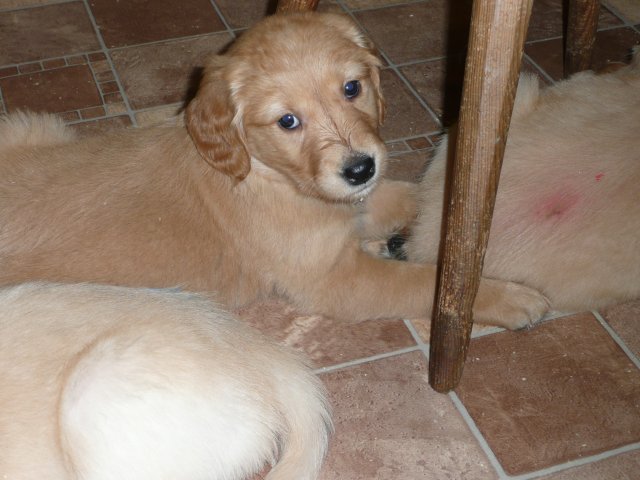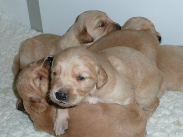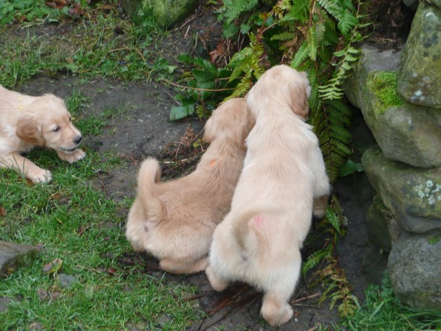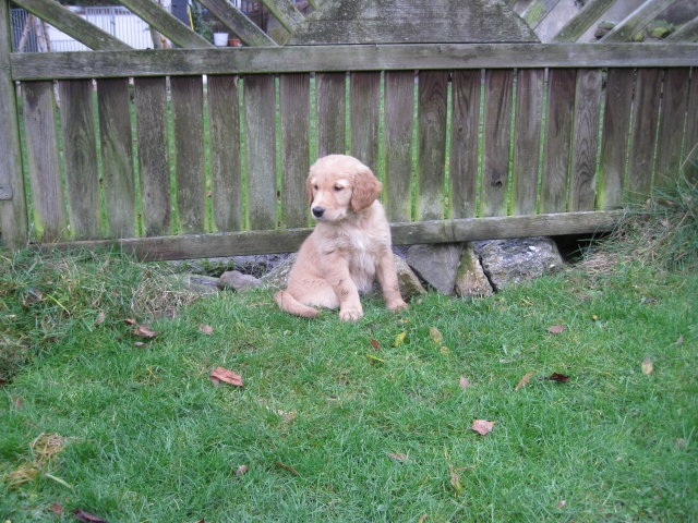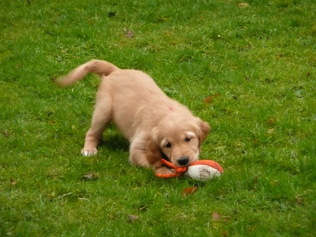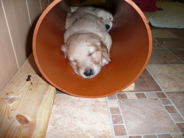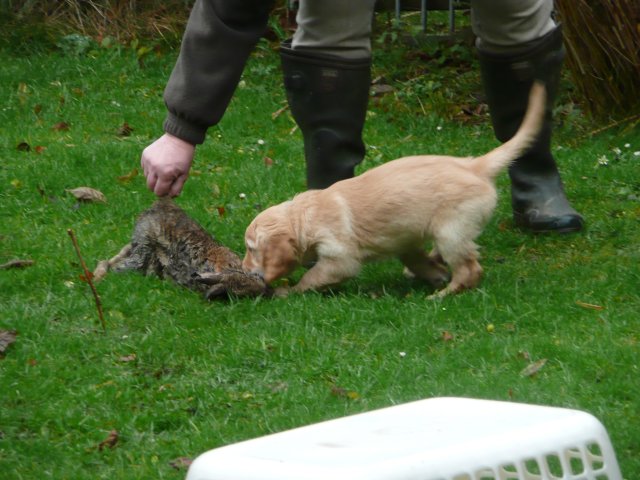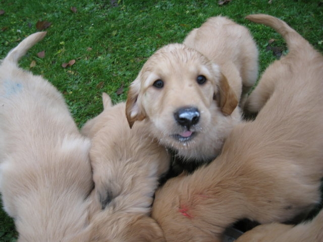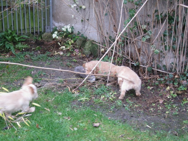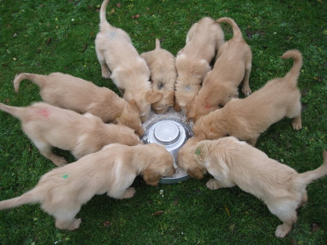 Es wird immer turbulenter in unserem Haus. Die Bande wächst und gedeiht und heckt immer mehr Unfug aus. Schade das das Wetter so nass ist, so kann die Bande immer nur kurz in den Garten. Je öfter sie im Garten waren, um so mehr jammern sie danach. Gott sei Dank haben wir unsere großen Mädel, sie beschäftigen die Kleinen wo sie nur können und dürfen. Ich habe auch wieder kleine Videos von dem Treiben...kann sie im Moment leider nicht hochladen, unser PC hat eine Macke und stürzt regelmässig ab....ich arbeite daran. Für diese Woche, Sonntag der 1.1.12 stand auch der Babytest an, leider kam alles anders als geplant....das Wetter so schlecht, das Gelände für den Test stand unter Wasser, wir hatten schon alles in den Wind geschrieben. Doch ab Mittags wurde es besser, es nieselte nur noch ganz leicht. Mein Mann und ich nahmen die Gelegenheit beim Schopf und nahmen den hinteren Teil unseres Gartens, den hatten die Welpen noch nicht gesehen. Normalerweise führen wir den Test nicht selber durch, aber die wiedrigen Umstände ließen uns keine andere Wahl. Die Welpen zeigten sich sehr zufriedenstellend, meine Beobachtungen während der sieben Wochen wurden bestätigt. Mein Mann hielt den Test fleissig in Bildern fest. Doch leider wurde beim Kopieren, auf unser externes Bilderlaufwerk, die Bilder von sieben Welpen gelöscht und da mein Mann den Kamerachip schon geleert hatte waren die Bilder endgültig verschwunden...ich hätte heulen können, mein Mann hatte sich so eine Mühe gemacht. Aber man kann es nicht ändern....dafür haben die Welpen überzeugt.