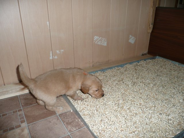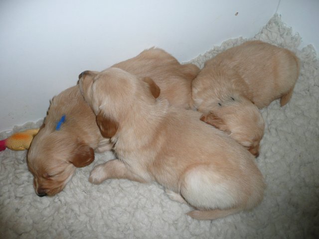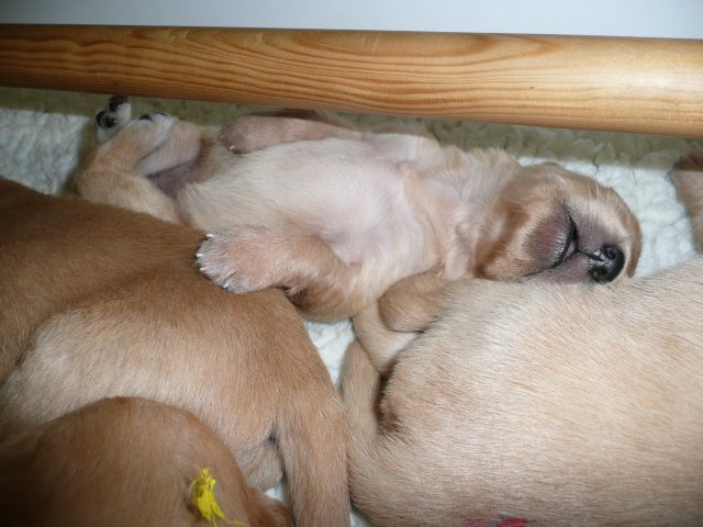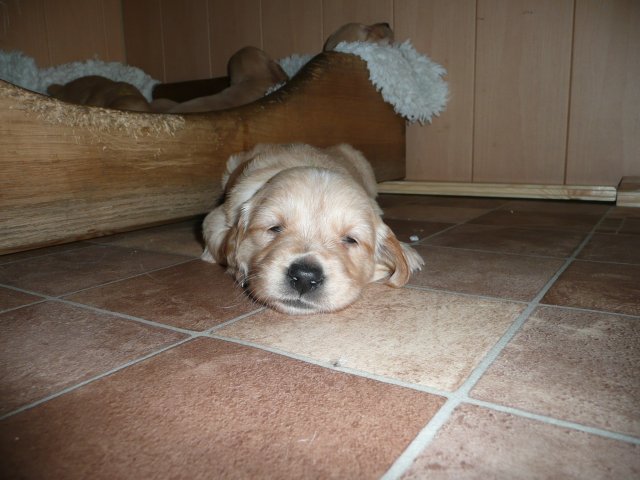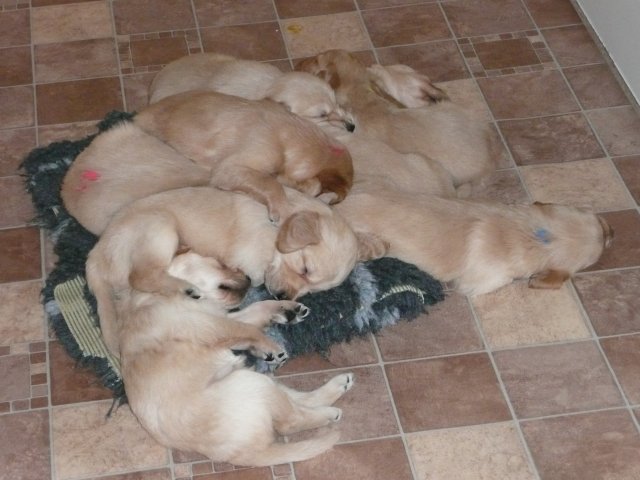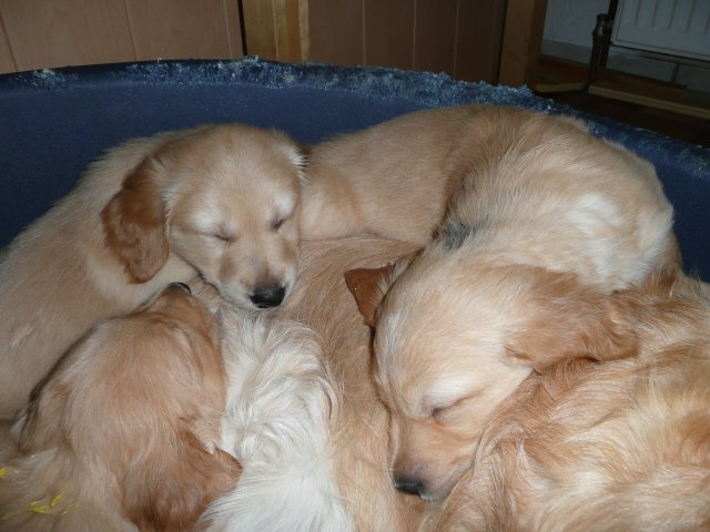 Es wird lebendig in der Wurfkiste. Bis jetzt bestimmte der Schlaf und das Säugen den Tagesablauf der Welpen aber nun möchten die Kleinen die weite Welt erkunden und sind mit der Wurfkiste nicht mehr zufrieden. Einen kleinen Ausreisser, wie die Mama damals war, haben wir auch dabei....einmal über die Kiste gekrabbelt hielt sie nichts mehr darin. Nun wollten die anderen auch und riefen lautstark nach Hilfe ;-) Es half alles nichts, das Zimmer der Großen wurde kindergerecht hergerichtet und heute war der große Tag...der Umzug. Ein letztes Mal gab es die heißgeliebte Ziegenmilch im Welpenzimmer, welche schon recht manierlich aus dem Welpenring geschleckt wurde und wie üblich noch einen Nachschlag von Mutters Milchbar. Satt und schläfrig ging es mit dem Umsetzen recht gut und ihren Verdauungsschlaf hielten die Kleinen in der noch aufgebauten Wurfkiste. Nach dem Schlaf war es Schluß mit lustig, alles schrie....wir wollen hier raus....nun gut, Klappe auf und das Zimmer wurde von vorne bis hinten erkundet. Keine Ecke wurde übersehen und die Hundetoilette wurde auch schon eingeweiht. Ich bin jedesmal erstaunt, woher die Kleinen so schnell wissen, wofür diese Ecke da ist. Merle beobachtete das Geschehen aus ihrer Holzkiste aber es dauerte nicht lange und sie wurde entdeckt und ruck zuck war die ganze Bande bei ihr. Erkundungen machen hungrig und so holte sich die Bande ihre Stärkung bei der Mama ab. Erkundungen machen aber auch müde und ein voller Bauch auch. Die kleine Familie kuschelte sich in der Kiste zusammen und sie hielten gemeinsam ihren Verdauungsschlaf. Nach dem die Akkus wieder voll waren wurde gespielt und auch schon kleine Rangeleien ausgetragen. Spiel und Spass macht hungrig...Mamaaa, wo bist duuuu....aber Mama stellte sich taub. Na gut, dann gibt es eben Ziegenmilch mit Hirseflocken und geriebenen Apfel...und siehe da, die Mama war nicht mehr taub, sie hatte das Klappern der Schüssel gehört und wartete jetzt auf die Reste ;-) Alles in Allem war es ein aufregender Tag für die Kleinen, die sich nach kurzer Zeit in ihrer neuen Umgebung recht wohl fühlen. Die Nacht verbringen sie noch zusammen in der geschlossenen Wurfkiste...aber wie lange noch?