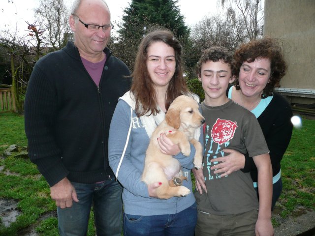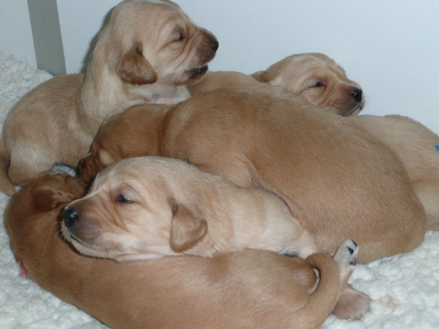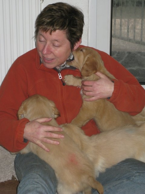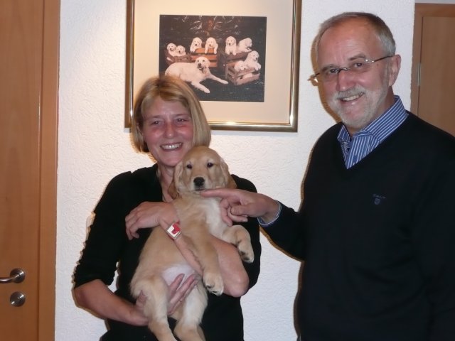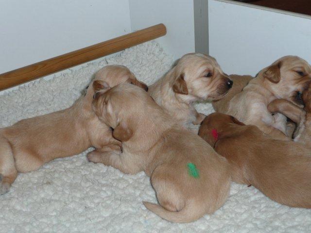 Nun sind sechs unserer Welpen in ihren neuen Familien...aber der Reihe nach. Vorher stand ja noch der Tierarztbesuch mit Impfen und Chippen an. Die Fahrt verlief relativ ruhig, 2-3 Kameraden meinten, sie müssten gegen das Radio ansingen, sie haben aber nach kurzer Zeit aufgegeben und sich ruhig zusammengerollt. Beim Tierarzt war schon alles vorbereitet und da wir wieder in der Mittagspause da waren, mussten die Mitarbeiterinnen die Kleinen erst einmal knuddeln, was diese natürlich mit Freuden annahmen. Nun ging alles zügig, Untersuchung, Impfen und Chippen und da alle sehr tapfer waren und keinen Laut von sich gaben, wurden sie mit einem Leckerchen belohnt. Nach kurzer Zeit ging es auch schon wieder Richtung Heimat. Zu Hause angekommen wurde erst einmal ausgiebig getobt, bevor sich die Bande zur Ruhe begab. Freitag den 6. 1. stand die Wurfabnahme an. Diese verlief sehr zufriedenstellend....auf beiden Seiten :-) Die Welpen, sie hatten sich vorher so richtig ausgespielt, waren bei der Kontrolle ruhig und ließen alles mit sich anstellen....abtasten, Zahnkontrolle und was sonst noch dazu gehört, alles wurde ohne Protest hingenommen. So stand dann auch in der Beurteilung zum Verhalten der Welpen : zutraulich, lebhaft ausgeglichen. Zur Bemerkung Mutterhündin/Welpen/Aufzucht: Mutterhündin in gutem Gesundheitszustand, Welpen: sehr homogener schöner und zutraulicher Wurf. Liebevolle und sachverständige Aufzucht!....was will man mehr Smile