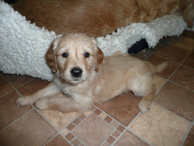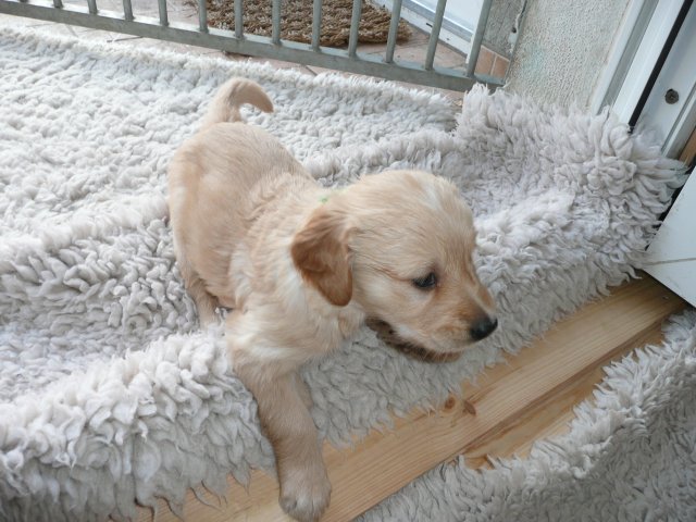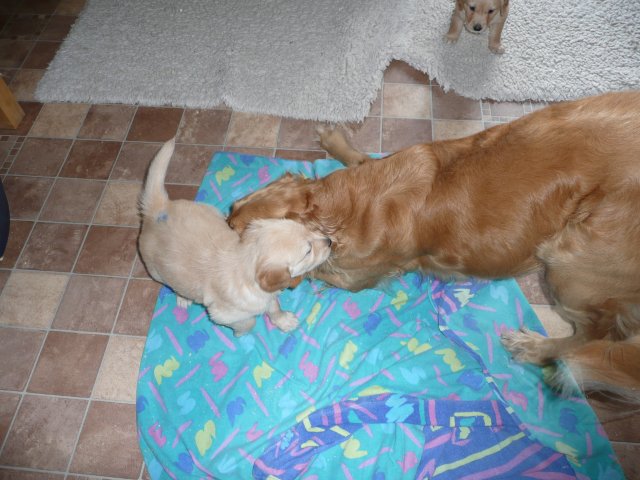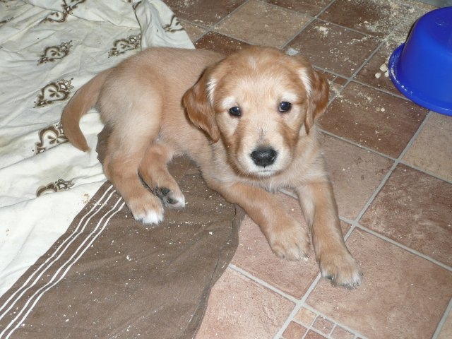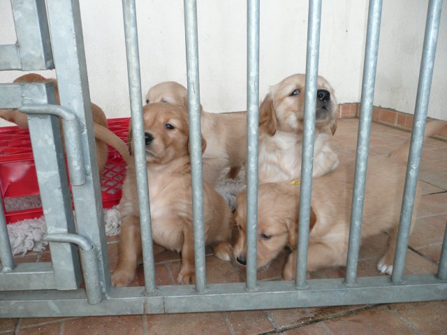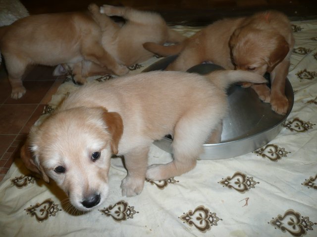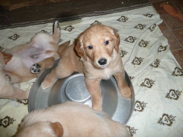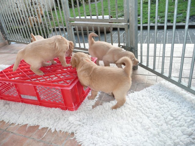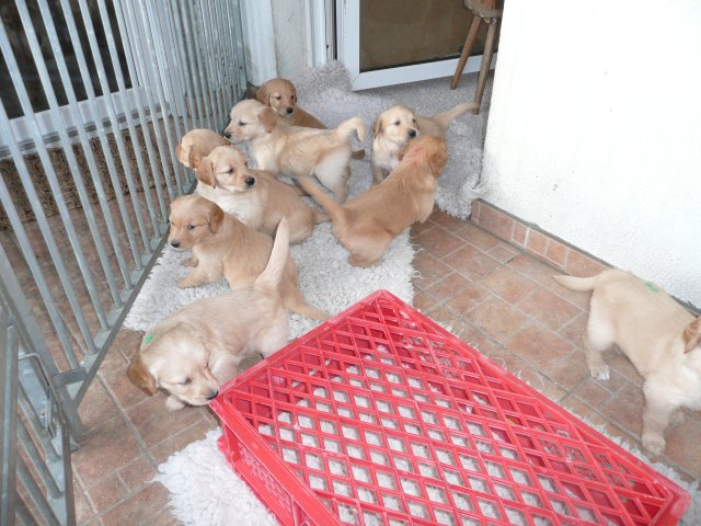 Heute am Sonntag waren die Kleinen das erste Mal im Freien. Als die Tür aufging, drängten sie sofort nach draussen. Was waren da für viele neue und interessante Gerüche, alles mußte untersucht werden. Merle lief aufgeregt zwischen ihren Kleinen herum und versuchte alle zusammen zu halten. Als alles nichts half, stellte sie sich hin und öffnete ihre Milchbar...so hatte sie ihre Bande wieder unter Kontrolle. Ich wollte soviele Bilder machen, aber immer wenn ich in die Hocke ging, hatte ich die Lütten an der Hose und an der Kamera hängen. Onia durfte die Kleinen auch bespielen, aber immer unter den Augen von Merle. Camilla hatte es sich in der Zeit im Korb bequem gemacht und wartete sehnsüchtig dass die Welpen sie entdecken. So nach und nach wurden die Kleinen dann müde und gesellten sich zu Camilla und alle fanden einen Platz im Korb. Wir haben den ganzen Nachmittag nichts mehr von der Bande gehört und gesehen....und von Camilla auch nichts. Als es Fressenszeit war, konnte ich die Kleinen überreden heraus zu kommen und Camilla wiederwillig zum Aufstehen zu bewegen. Einige Fotos kann ich vom heutigen Tag doch noch zeigen.