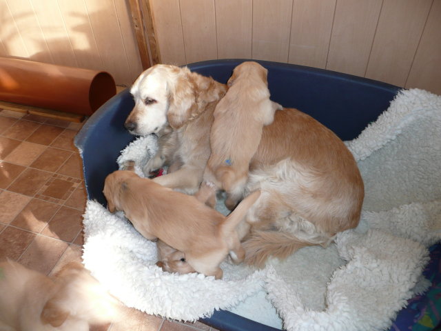 Leider gab es noch eine unschöne Nachricht, fünf Tage vor der Welpenabgabe, bekamen wir noch eine Absage. So tummeln sich noch drei kleine Hündinnen im Welpenzimmer. Unsere Großen genießen es, obwohl ich denke, sie möchten auch mal wieder im Mittelpunkt stehen.