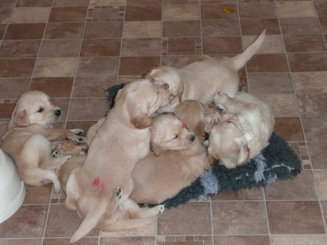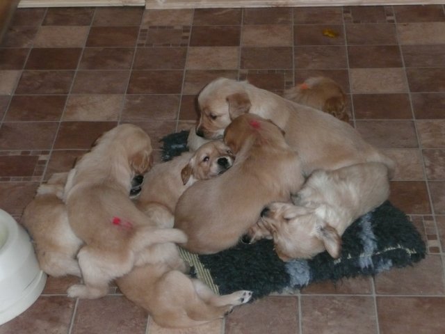 Nun sind die Kleinen schon 6 Wochen alt, wie schnell die Zeit vergeht. Sie machen uns so viel Freude, jeder auf seine eigenen Art. Onia ist auch ganz fasziniert und die Kleinen können mittlerweile ihr temperamentvolles Spiel gut einschätzen und sie lieben es. Nach wie vor ist Camilla die Nanny und sie ist seelig, wenn sie bei den Kleinen sein darf. Merle ist auch ein wunderbarer Spielkamerad, wenn die Kleinen erst einmal wissen, die Milchbar bleibt verschlossen, spielen sie sehr schön zusammen. Merle fängt nun auch schon an die Kleinen zu entwöhnen und bringt ihnen ihr gefressenes Futter, worauf sich die Bande mit Heißhunger stürzt und keinen Krümel liegen lässt. Vorsorgemässig haben sie ihre 3. Wurmkur bekommen und am Freitag den 23. haben wir unsere erste Autofahrt unternommen.....es ging zum Tierarzt zur ersten Impfung. Bevor es losging, wurden die Kleinen noch gut bespielt....in der Hoffnung, sie etwas müde zu bekommen um eine stressfreie Fahrt zu haben. Alle Neune kamen in die große XXL Box, Merle und Onia waren auf Augenhöhe im Hundeabteil untergebracht. Was soll ich sagen, unsere Überlegungen waren richtig. Einer nach dem Anderen rollte sich zusammen und sie verschliefen die 1/2 stündige Fahrt zur Praxis. Wir hatten unseren Termin in der Mittagspause, da waren keine anderen Patienten da und die Untersuchung mit Impfung ging zügig voran. Die Babies genossen den Besuch....bei so vielen streichelnden Händen und ein Leckerchen merkten sie von dem Pieks der Nadel überhaupt nichts. Fazit von unserem Tierarzt.."alles gesund und munter, sie machen einen guten Eindruck, sind sehr freundlich und bei den Rüden ist schon ALLES da, wo es sein sollte". Ruck zuck waren wir wieder auf dem Heimweg, der genau so ruhig und entspannt verlief wie der Hinweg. Zuhause angekommen waren sie ausgeruht und die Lebensgeister wieder hellwach, das bekamen wir dann auch zu spüren ;-) Heute am Sonntag kann ich sagen, sie haben die Impfe sehr gut vertragen, es gab kein Durchfall und alle waren putzmunter. Putzmuntere Welpen sehen wir auf dem kleinen Film und einige aktuelle Bilder zeige ich auch.