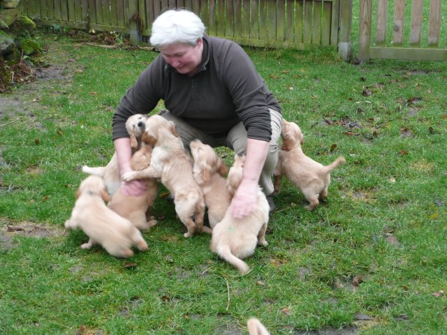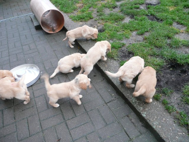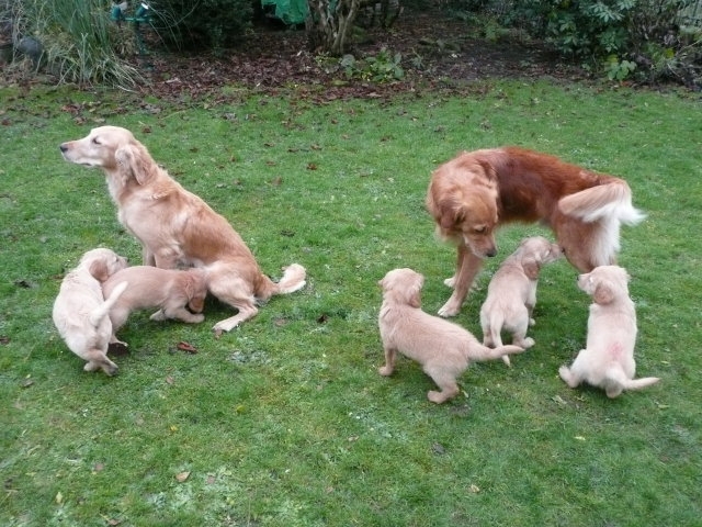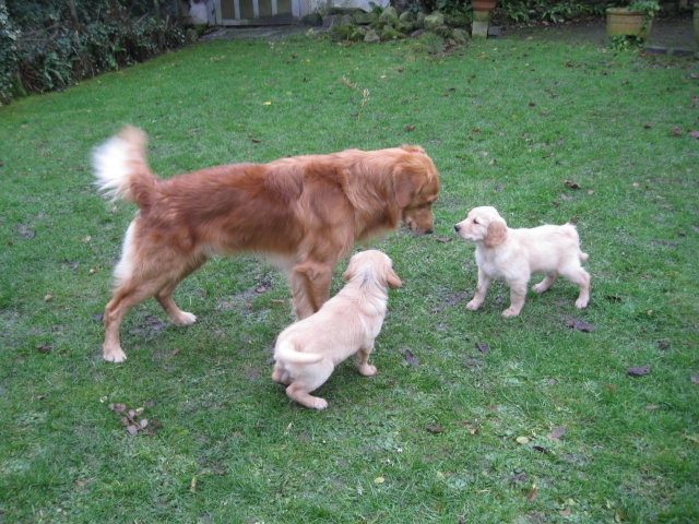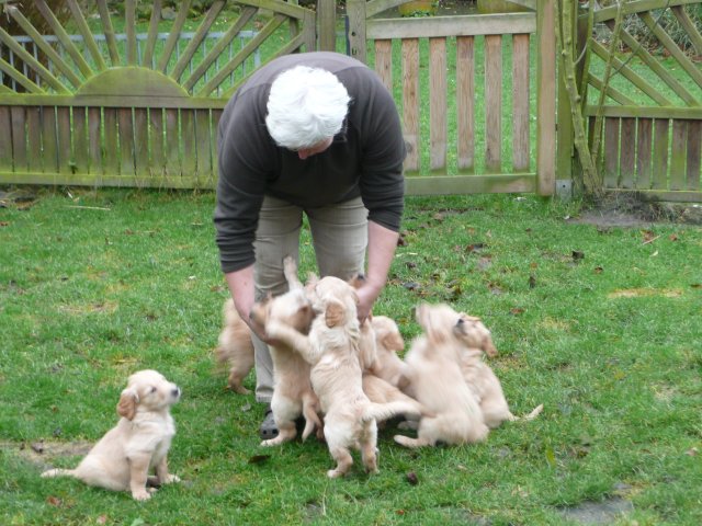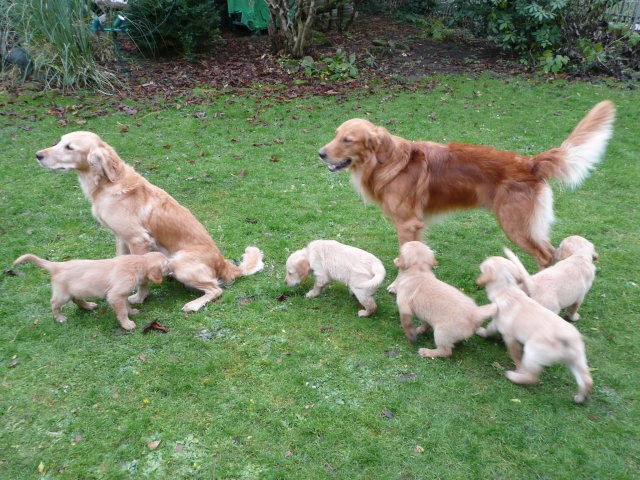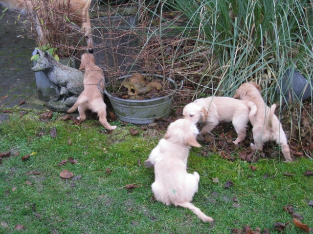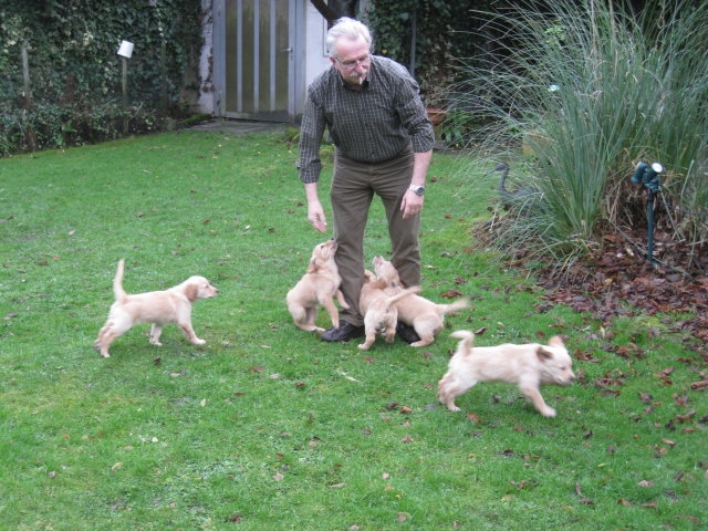 Da ich von der siebten Woche keine Bilder habe, nehme ich die Bilder von unserem heutigen ( Montag 2.1.12 ) Besuch noch mit hier rein. Beatrice Albrecht und Rob Groot, sie sind die Besitzer von Lachlann, wollten sich gerne die Kleinen anschauen. Da das Wetter es heute zu ließ, holten wir die Bande in den hinteren, trockeneren Teil des Gartens, den sie nur vom Babytest kannten. Du liebe Güte, da ging die Post ab...schlimmer als ein Sack Flöhe. Was wurde da alles untersucht, bis in die kleinsten Ecken mußten sie kriechen und dann kam auch noch ein fremder Hund dazu. Lachlann, der Papa der Kleinen gab sich ganz relaxt und ging sehr freundlich mit den Kleinen um. Nach anfänglichem vorsichtigem Beschnüffeln gingen die Rabauken in den Belagerungszustand über....alles kein Problem, Lachlann blieb ruhig und freundlich. Selbst unsere großen Mädels, die den Rüden schon mal ihre Meinung sagen, blieben ruhig und verhielten sich Lachlann gegenüber ganz neutral. Es war ein sehr schöner harmonischer Nachmittag und Rob und Beatrice waren auch sehr zufrieden mit Merles und Lachlanns Kindern. Nach einiger Zeit wurde die Bande müde und so brachten wir sie ins Haus. Hier wurde dann nur noch verhalten gespielt und so nach und nach legten die Kleinen sich zur Ruhe. Ich glaube sie werden von diesem Nachmittag rege träumen, haben sie doch so viel Neues erlebt. Ich möchte Euch auch daran teilnehmen lassen und so stelle ich die Bilder von dem schönen Nachmittag hier ein.