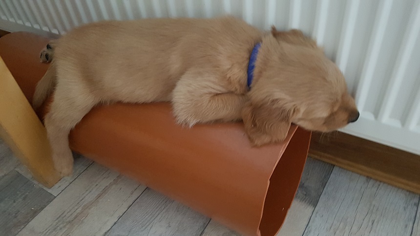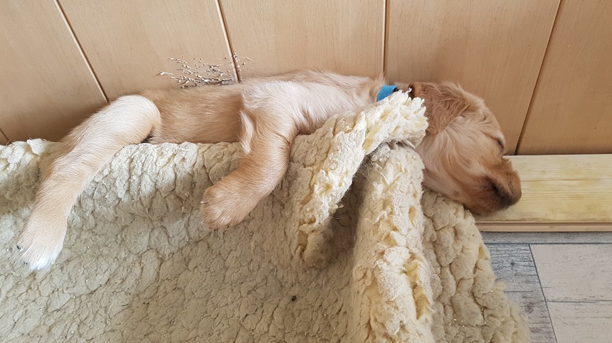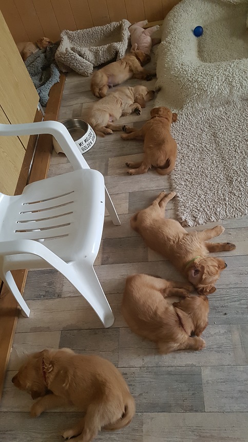Da es in diesen Tagen ziemlich warm und manchmal auch drückend draußen war, spielten die Welpen tagsüber viel im Zimmer....sie können selber wählen. Am Morgen und am Abend tobten sie sich auf der Terrasse aus. Die Wärme mögen sie nicht wirklich, sie liegen viel auf den kühlen Fliesen oder einfach auf dem nackten Boden. Es wird auch noch viel geschlafen, dafür sind die Ruhephasen kürzer aber öfter. Gerne spielen sie mit Yule und sie genießt die Kleinen, Sunny darf sich dann etwas ausruhen.