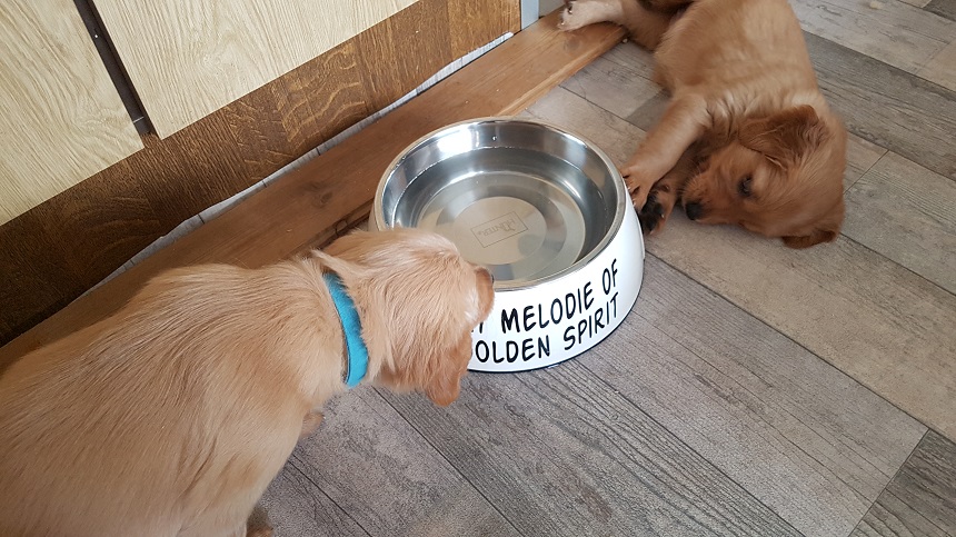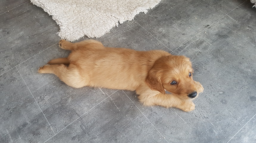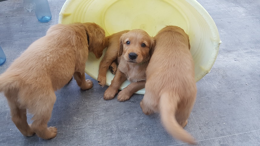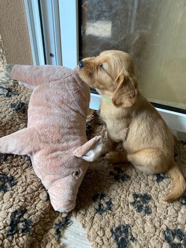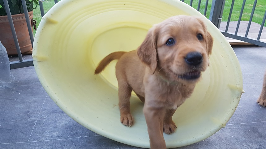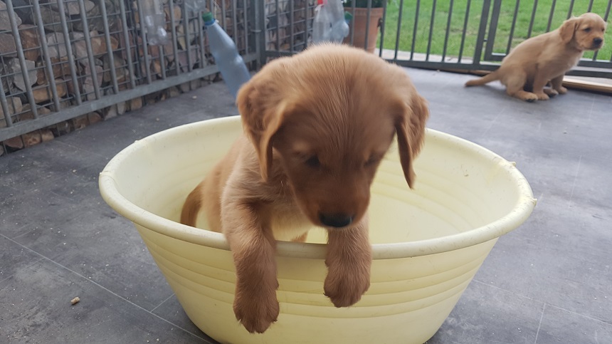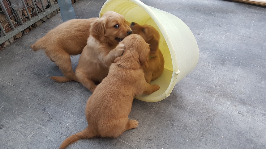 Zu Beginn der 6. Woche mussten wir Eingang zum Zimmer erhöhen....ausgerechnet an diesem Morgen hatte ich das Futter noch nicht vorbereitet...bei dieser hungrigen Meute geht das so gar nicht. Die Bande randalierte an der Barriere und schwupps war Einer drüber, dann der Nächste und wieder der Nächste, bis mir schon 6 Welpen entgegen kamen. Die Großen turnten auch noch dazwischen und ich wusste nicht wie ich mit 2 Schüsseln so schnell ins Zimmer kommen sollte. So, Schüsseln erst einmal abgestellt, die Welpen im Hundezimmer versuchten herüber zu kommen und die von meiner Seite versuchten ins Zimmer zu kommen...was für ein Gewusel so früh am Morgen. Nun war es aber geschafft, die Schüsseln standen auf der Terrasse und die Kleinen waren zufrieden und ich nassgeschwitzt. Ja, sie können einen schon flott machen. Da wir gerade dabei waren das Zimmer ausbruchsicher zu machen, bauten wir auch gleich die Wurfkiste ab. Die Kleinen erprobten daran ihre Zähne.