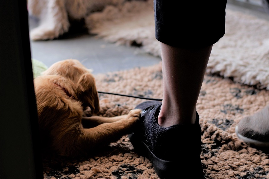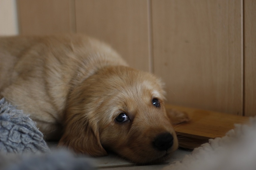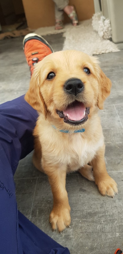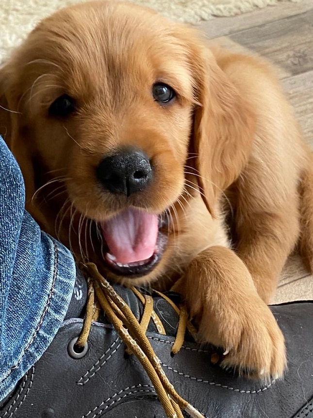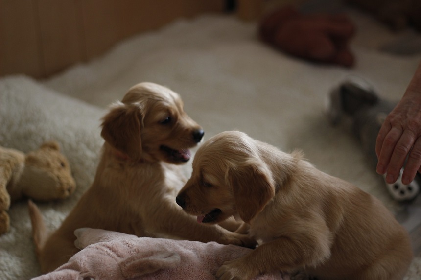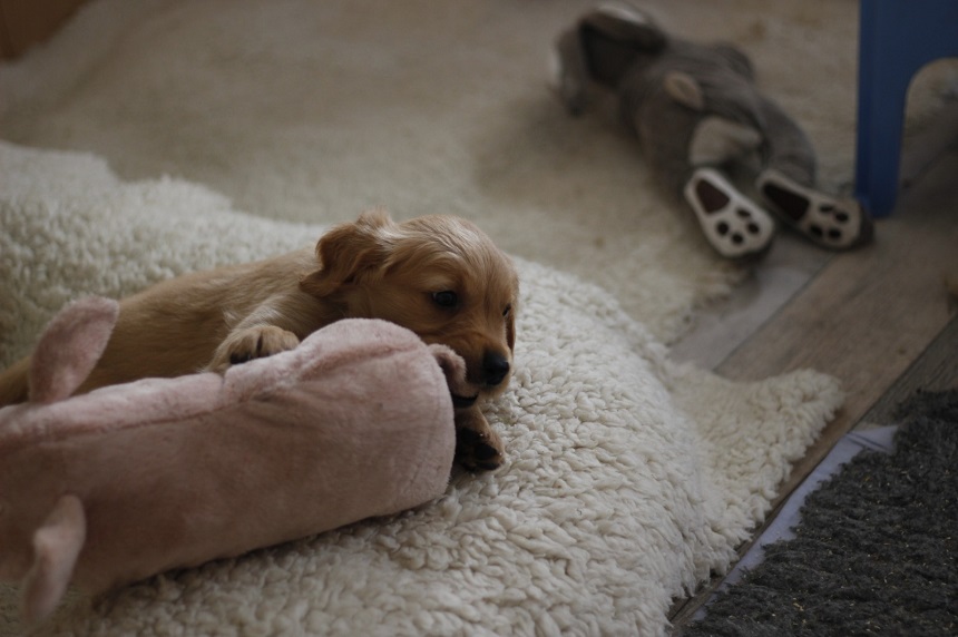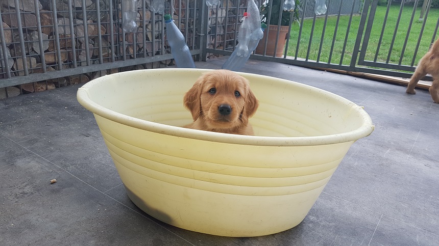 Zu Beginn der 6. Woche mussten wir Eingang zum Zimmer erhöhen....ausgerechnet an diesem Morgen hatte ich das Futter noch nicht vorbereitet...bei dieser hungrigen Meute geht das so gar nicht. Die Bande randalierte an der Barriere und schwupps war Einer drüber, dann der Nächste und wieder der Nächste, bis mir schon 6 Welpen entgegen kamen. Die Großen turnten auch noch dazwischen und ich wusste nicht wie ich mit 2 Schüsseln so schnell ins Zimmer kommen sollte. So, Schüsseln erst einmal abgestellt, die Welpen im Hundezimmer versuchten herüber zu kommen und die von meiner Seite versuchten ins Zimmer zu kommen...was für ein Gewusel so früh am Morgen. Nun war es aber geschafft, die Schüsseln standen auf der Terrasse und die Kleinen waren zufrieden und ich nassgeschwitzt. Ja, sie können einen schon flott machen. Da wir gerade dabei waren das Zimmer ausbruchsicher zu machen, bauten wir auch gleich die Wurfkiste ab. Die Kleinen erprobten daran ihre Zähne.