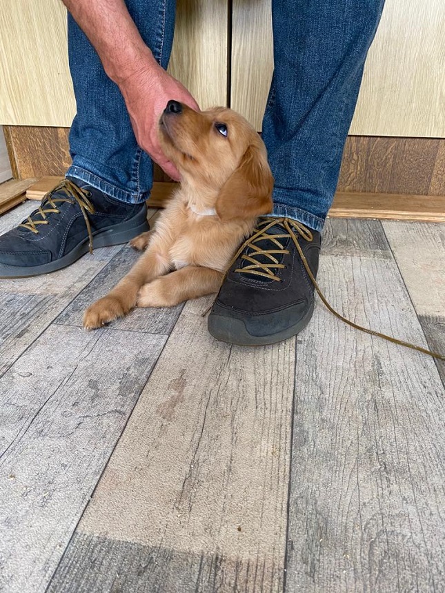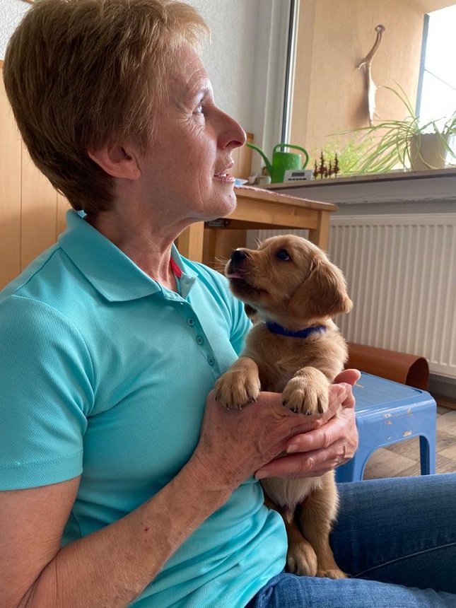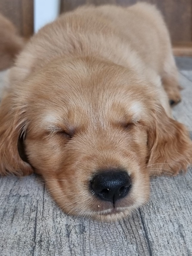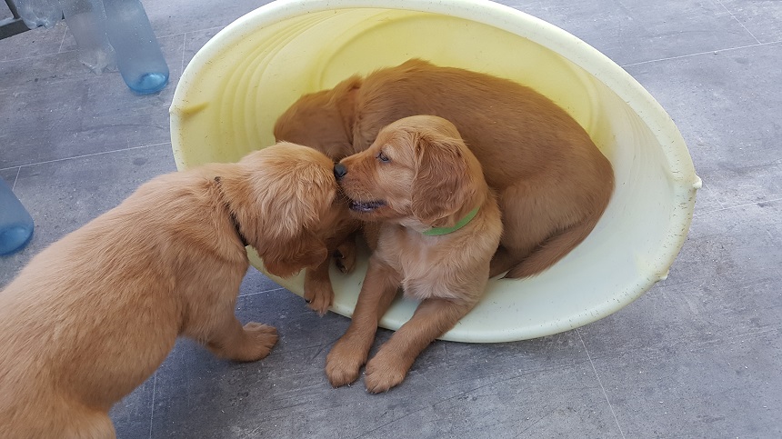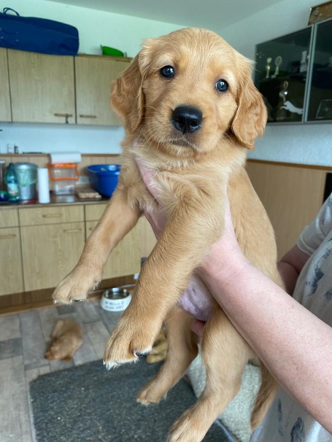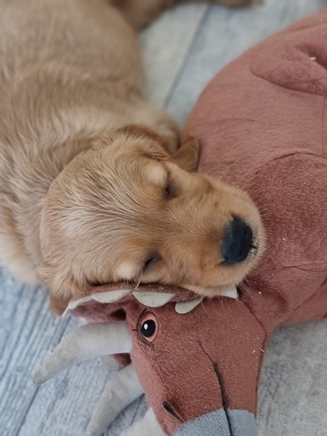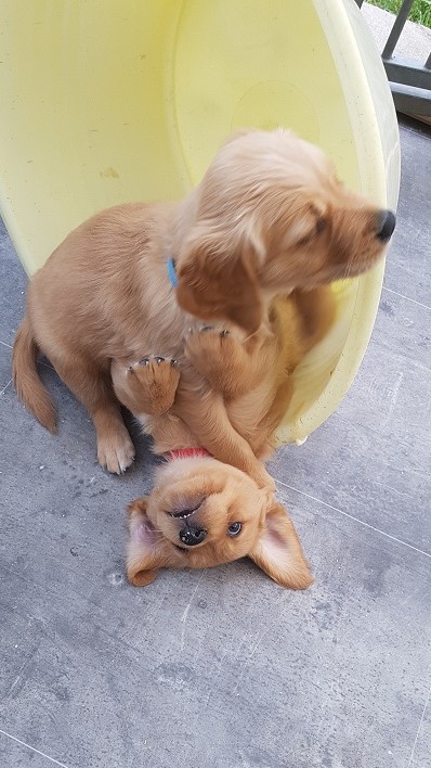 Bei der Hygiene stand mal wieder das Krallen schneiden und mit der 6. Woche die 3. Entwurmung auf dem Plan. Ansonsten werden die Spielereien ausgebaut...es werden schon kleine Rangkämpfe ausgefochten und wenn dann ein Welpe mal so richtig schreit, geht mir das durch Mark und Bein. Die Welpen sind jetzt nicht rauer als unsere Würfe davor...sie testen sich einfach aus, wo sie im Rudel stehen. Es sind aber auch kleine Schmuser, sie genießen die Streicheleinheiten und werfen sich schon freiwillig auf den Rücken und warten bis wir ihren Bauch kraulen. Sie machen sehr viel Freude.